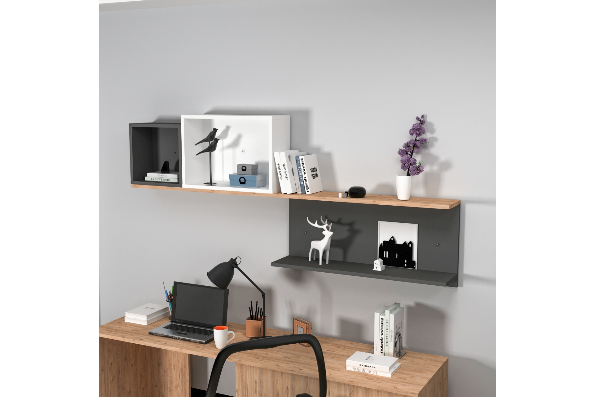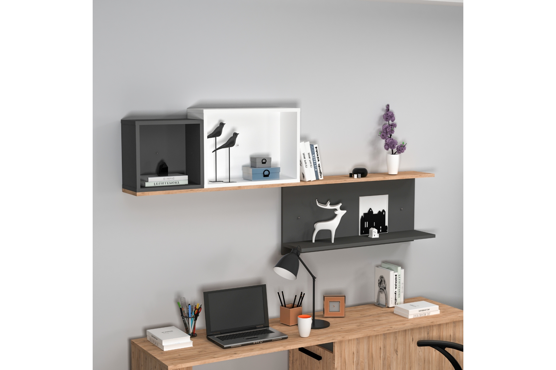 Ek Bilgiler3 BÖLMEDEN OLUŞAN GENÇ ODASI DUVAR RAFI. ATLANTİK ÇAM, ANTRASİT VE BEYAZ OLMAK ÜZERE 3 FARKLI SUNTALAM RENGİ KULLANILMIŞTIR.