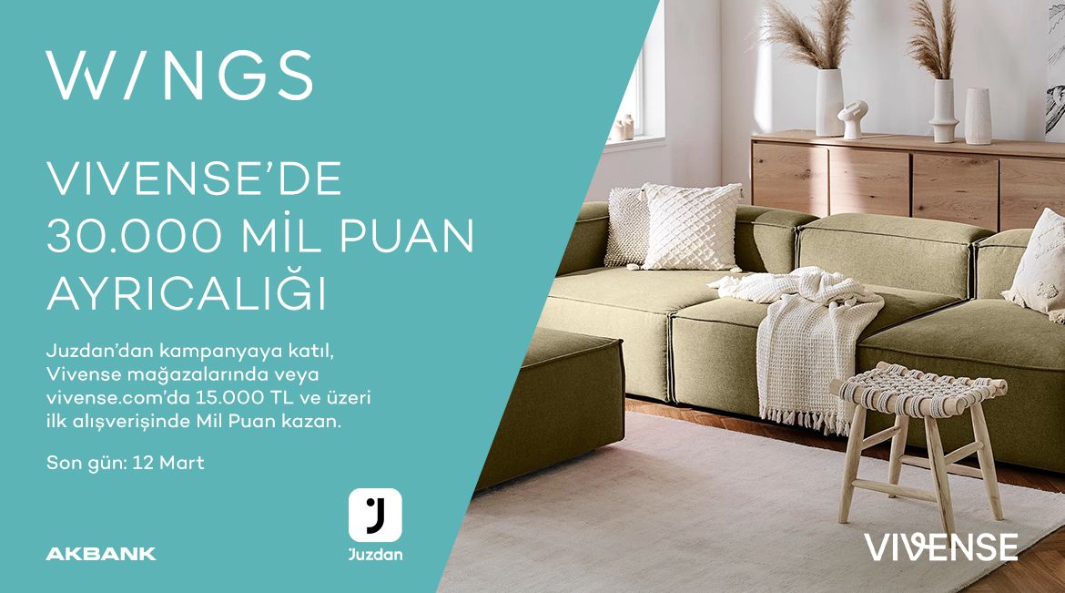 Wings’e özel 12 Şubat – 12 Mart 2026 tarihleri arasında Vivense mağazalarından veya Vivense.com’dan yapacağınız 15.000 TL ve üzeri ilk alışverişinize 30.000 Mil Puan ayrıcalığı.