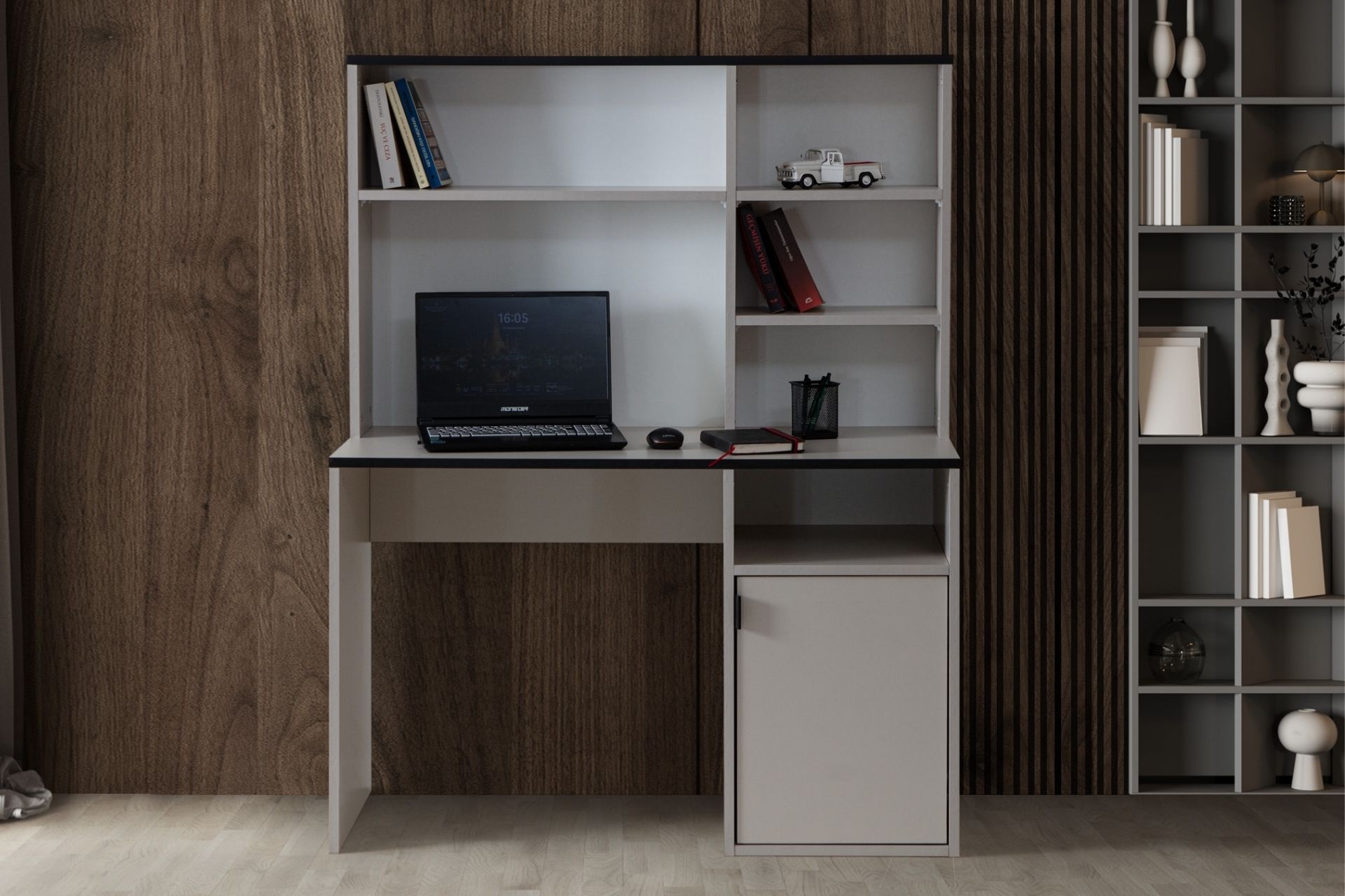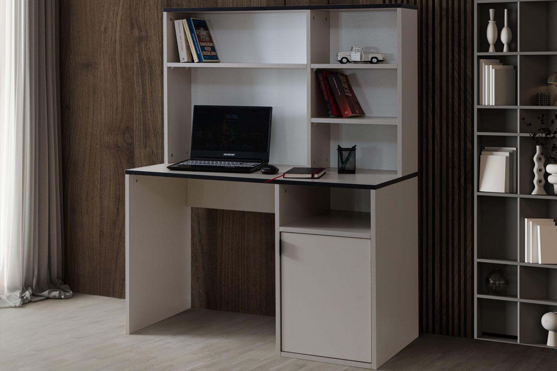 Ek BilgilerÜrün Özellikleri 1. Sınıf Melamin Kaplı Yonga Levha malzemeden üretilmiştir. Birleştirme aksesuarları olarak minifix ve kavela kullanılmıştır. Frensiz menteşe kullanılmıştır. Çalışma masası 4 raf ve dolaptan oluşmaktadır. Ürün Kurulu Ölçüleri : Genişlik : 110 cm Yükseklik : 141 cm Derinlik: 50 cm