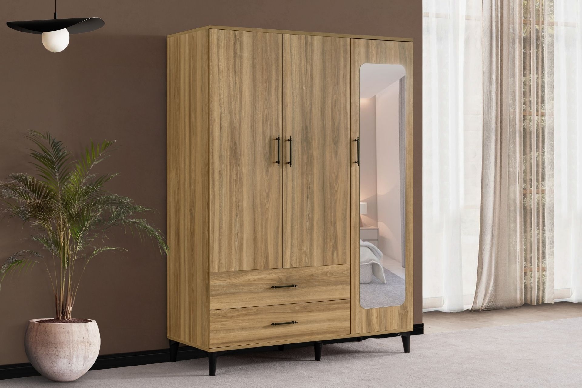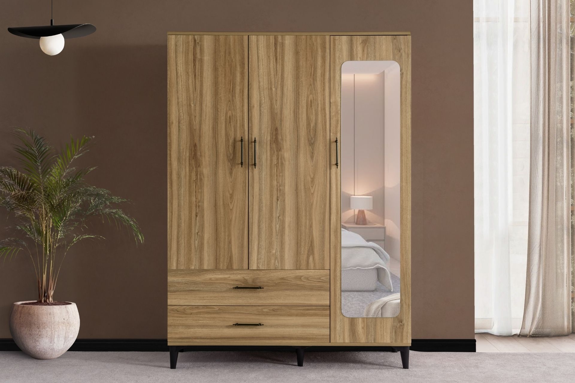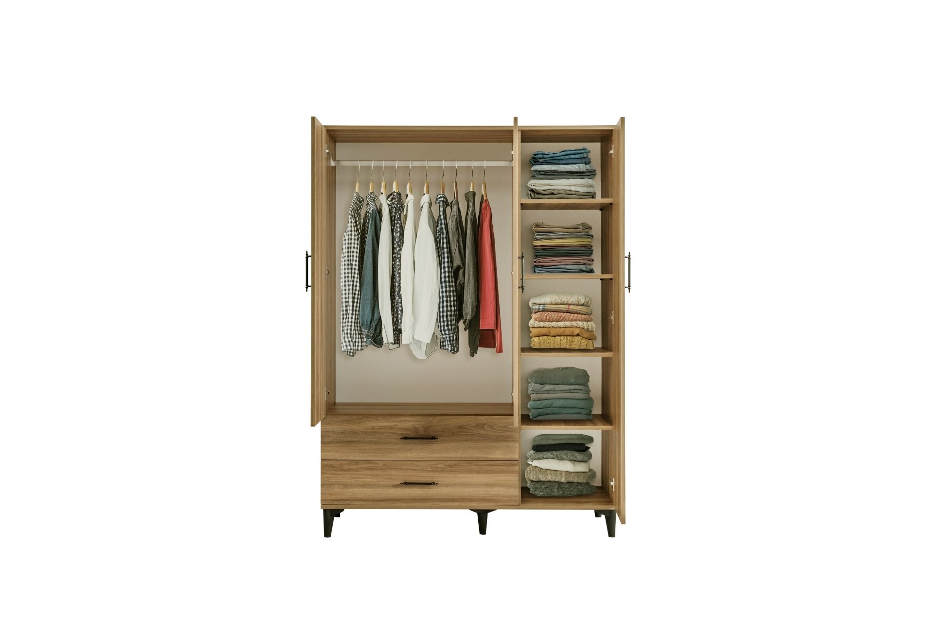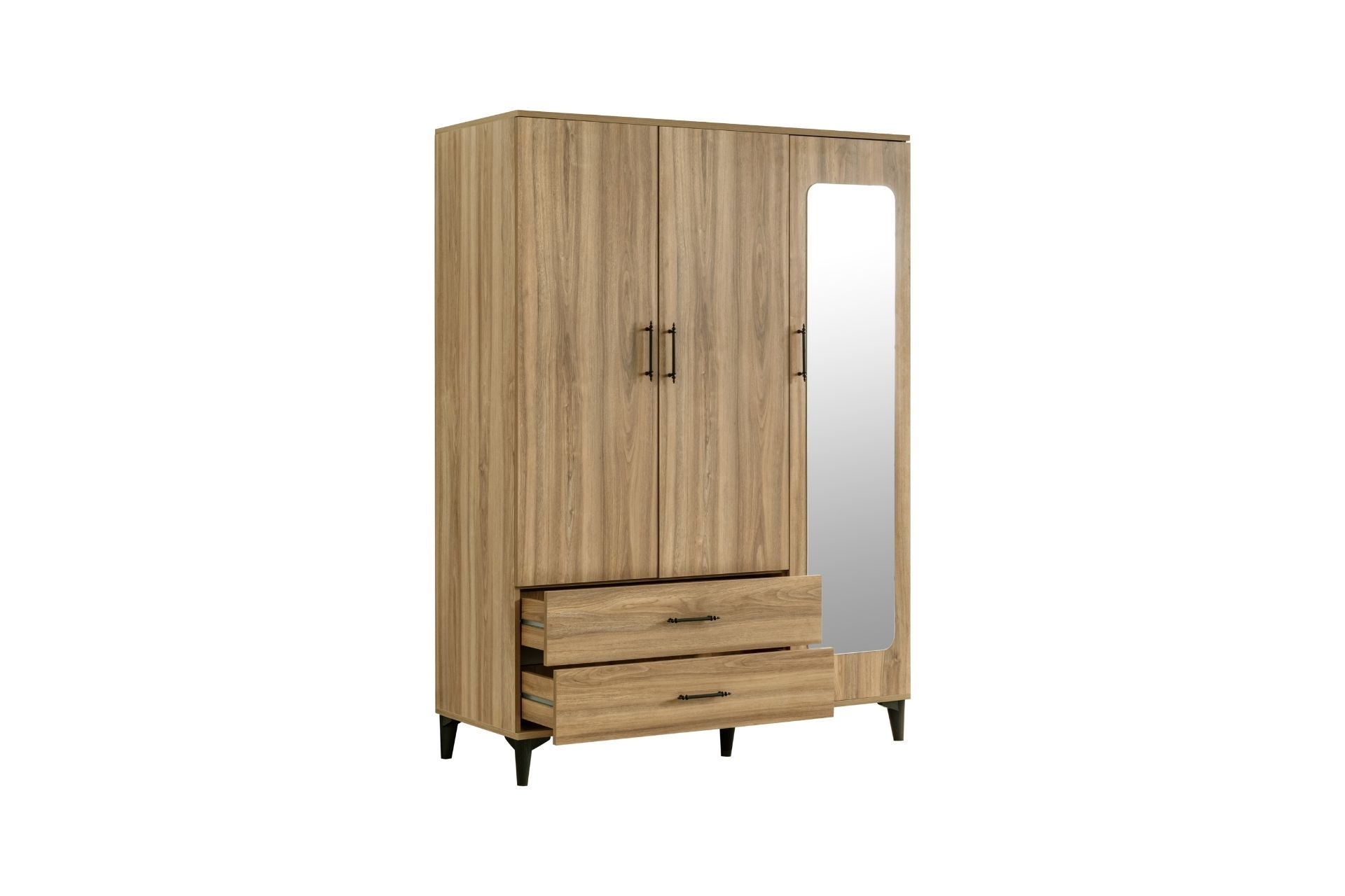 Ek Bilgiler1. sınıf melamin kaplı yonga levha malzemeden üretilmiştir. Dolap 3 kapaklı 2 çekmecelidir. Dolap içerisinde 5 raf bölümü 1 askılık bölümü bulunmaktadır. Ürün Kurulu Ölçüleri Yükseklik: 190 cm. / Genişlik : 137 cm / Derinlik : 50 cm.