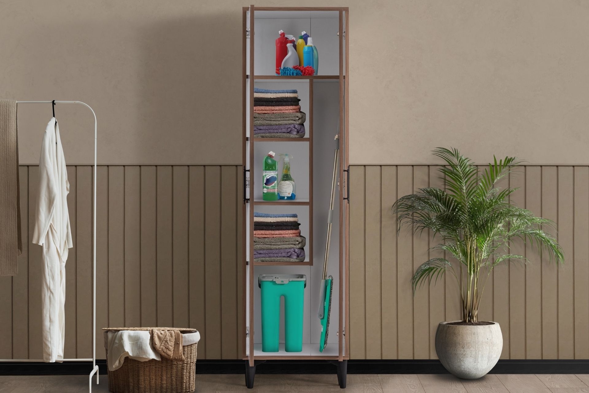 Ek BilgilerÜrünümüz Melamin Kaplı Yonga Levha malzemeden üretilmiştir. Ürün kulp ve ayakları plastik malzemedir. Ürün Kurulu Ölçüleri : Genişlik : 50 cm Yükseklik : 180 cm Derinlik: 35 m Dolap ayak 15 cm En üst raf arası 30 cm Küçük raf araları 27cm Kova için ara yükseklik 42cm Uzun dar ara yükseklik 129cm Üst uzun raf genişlik 46cm Alt dar raf genişlik 29cm Dolap dış genişlik 35cm