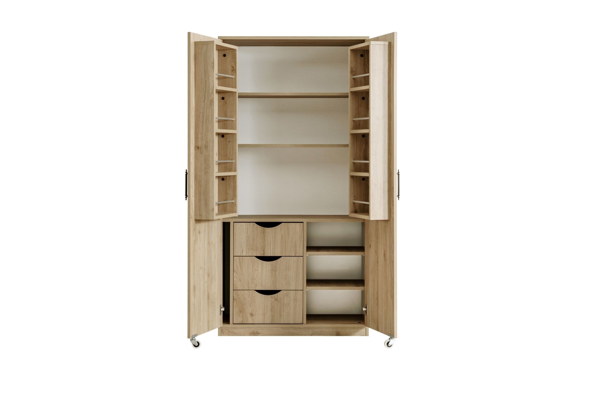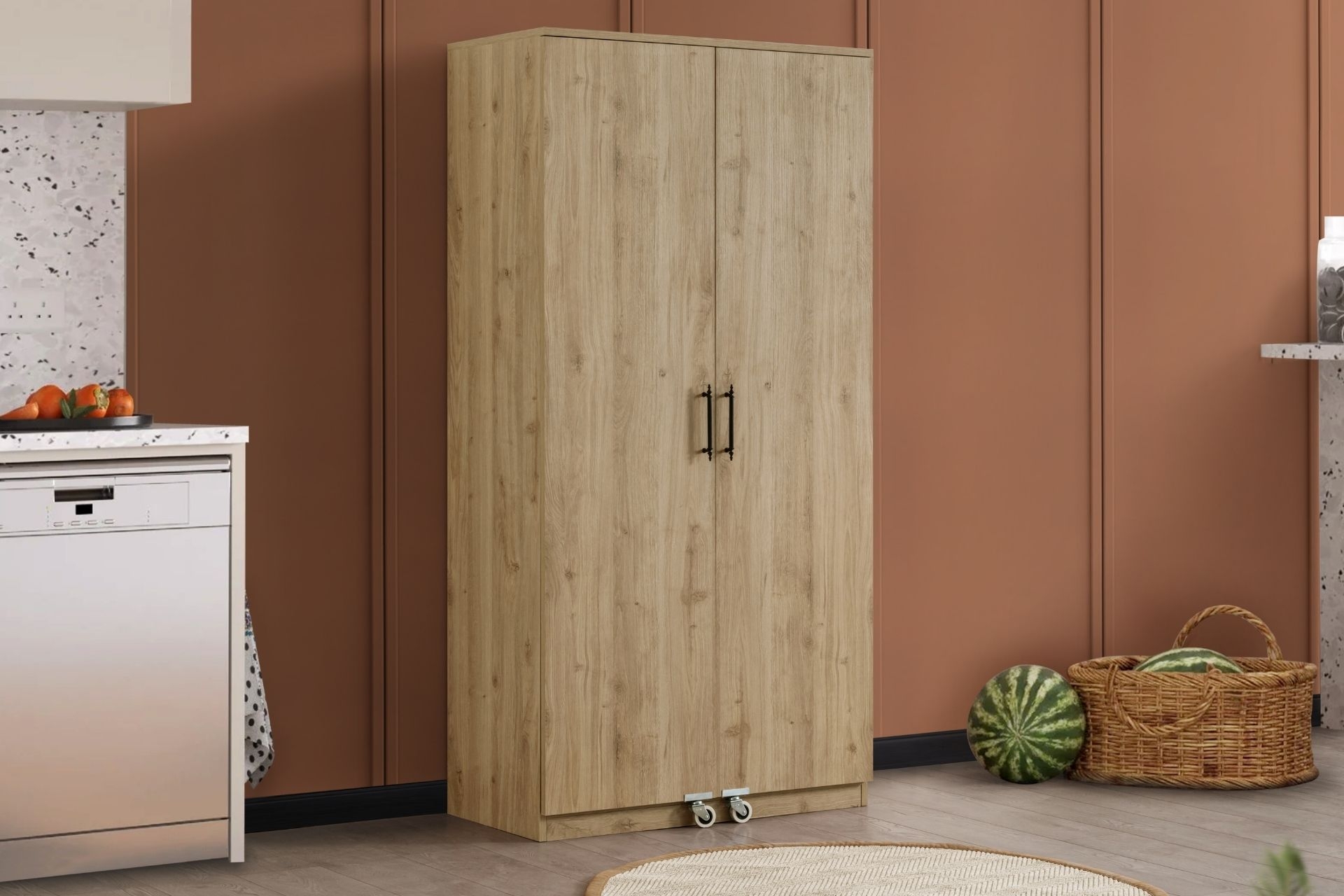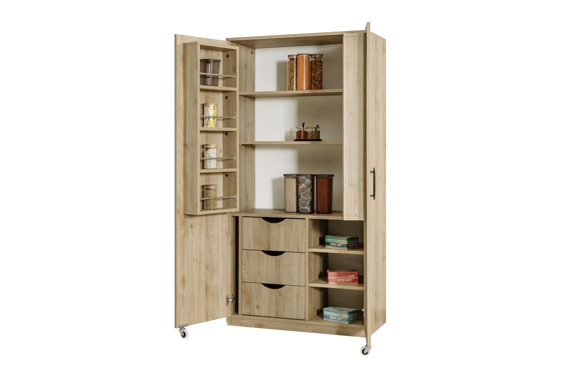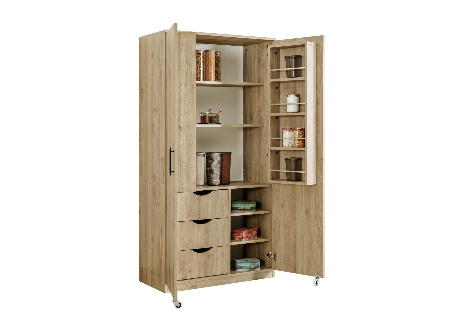 Ek BilgilerErzak dolabı 1.sınıf melamin kaplı yonga levha malzemeden üretilmiştir. Çok fonksiyonlu gözlü iç bölmelere sahiptir Dolap raf ve 3 çekmeceden oluşmaktadır. Ürün Kurulu Ölçüleri: Genişlik : 90 cm Yükseklik :180 cm Derinlik : 45 cm