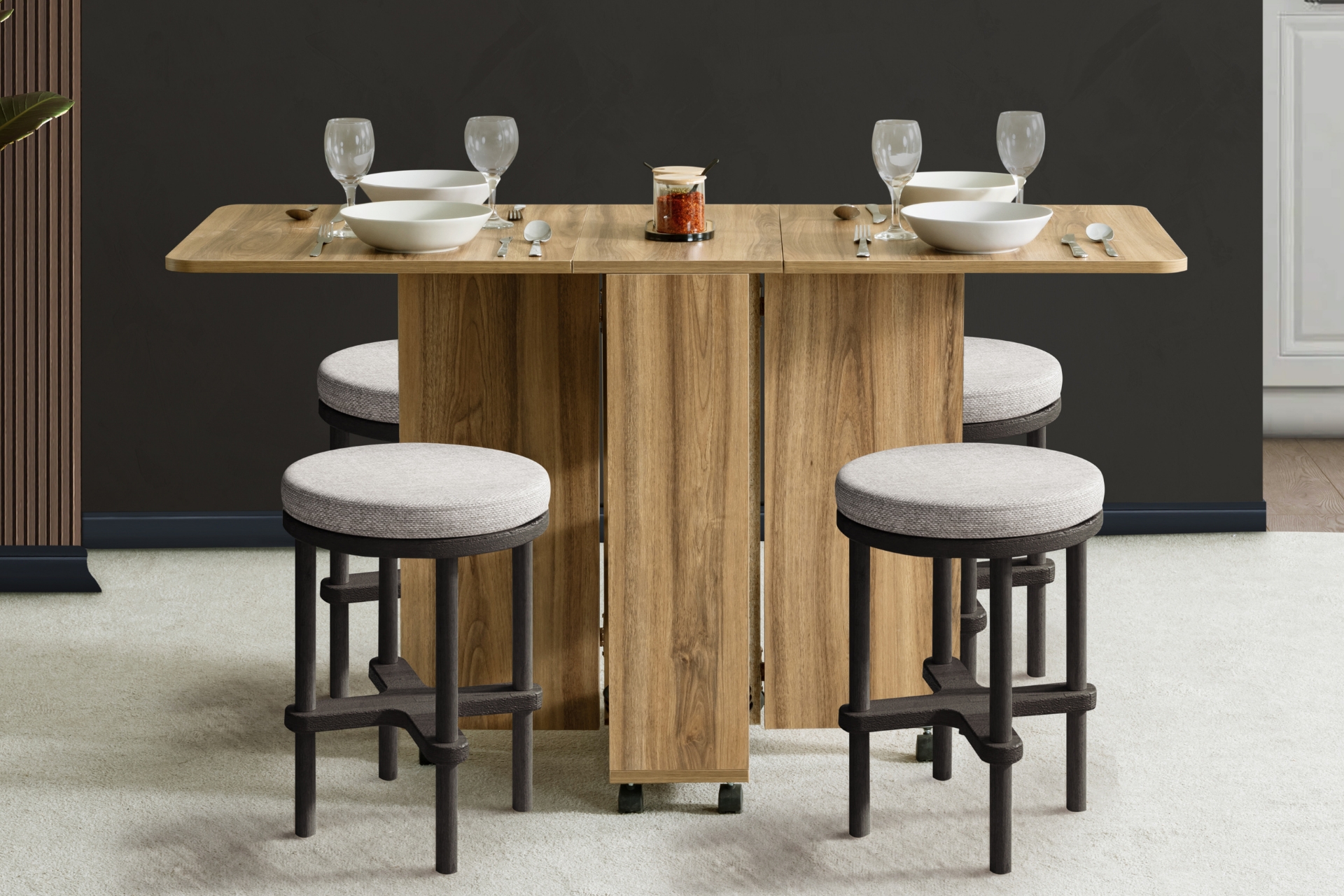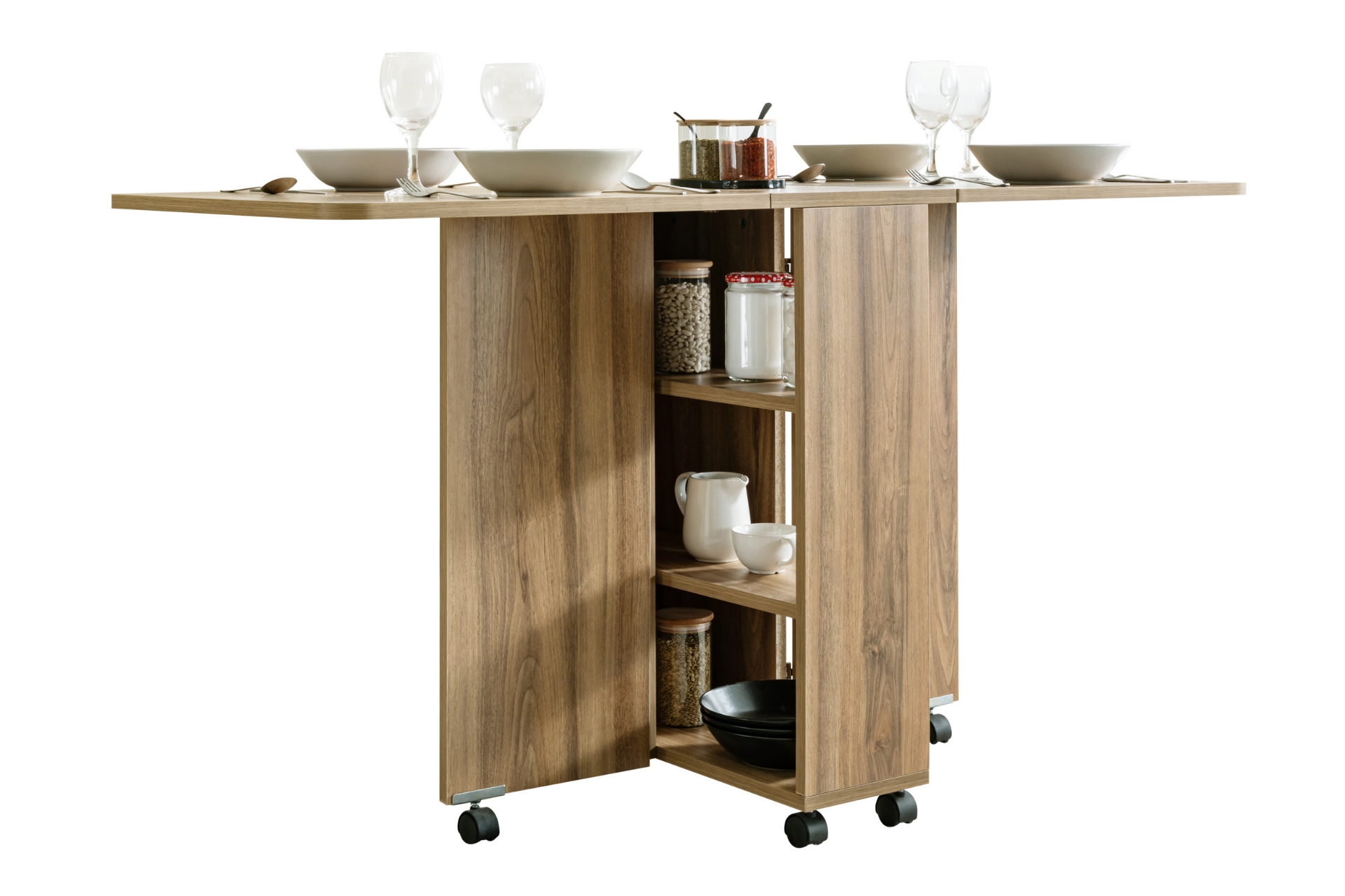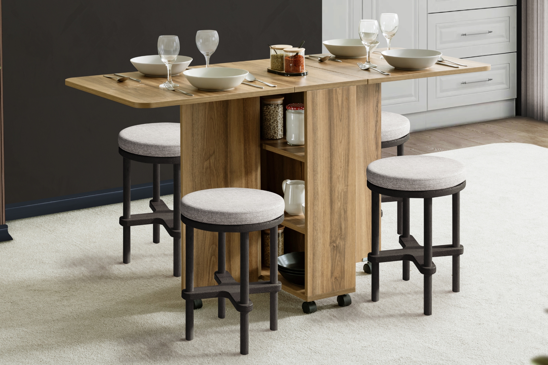 Ek Bilgiler1. Sınıf Melamin Kaplı Yonga Levha malzemeden üretilmiştir. Birleştirme aksesuarları olarak minifix ve kavela kullanılmıştır. Hareketli yapı: 360° dönebilen tablalı döner tekerlekler ile kolay taşıma Kelebek ve yaprak menteşe kullanılmıştır. Katlanabilir tasarım: Açılır kapanır mekanizma ile yerden tasarruf. Ürün Kurulu Ölçüleri : Genişlik : Açık 145 cm Kapalı 35 cm Yükseklik : 80 cm Derinlik: 60 cm