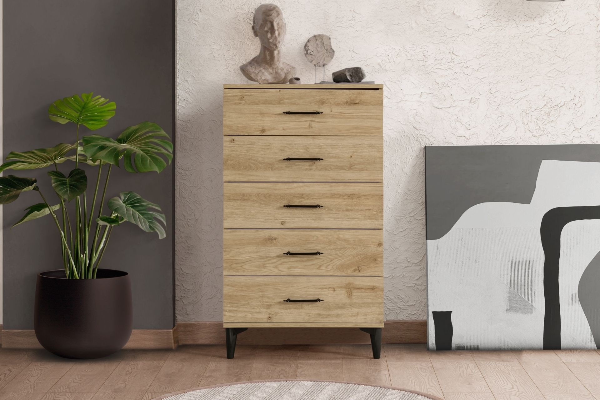 Ek BilgilerÜrünümüz Melamin Kaplı Yonga Levha malzemeden üretilmiştir. Çekmecelerde bilyeli ray kullanılmıştır. Şifonyer kulp ve ayakları plastik malzemedir. Ayak yüksekliği 10 cm dir. Ürün Kurulu Ölçüleri : Genişlik : 70 cm Yükseklik : 120 cm Derinlik: 38 cm