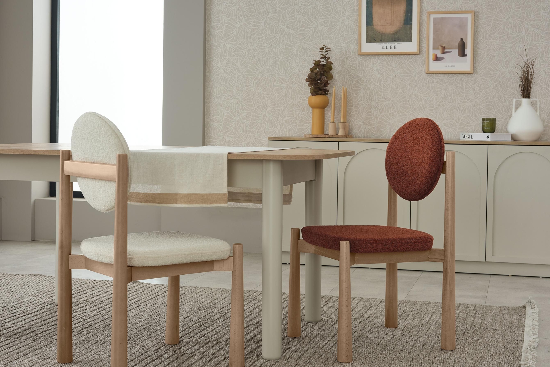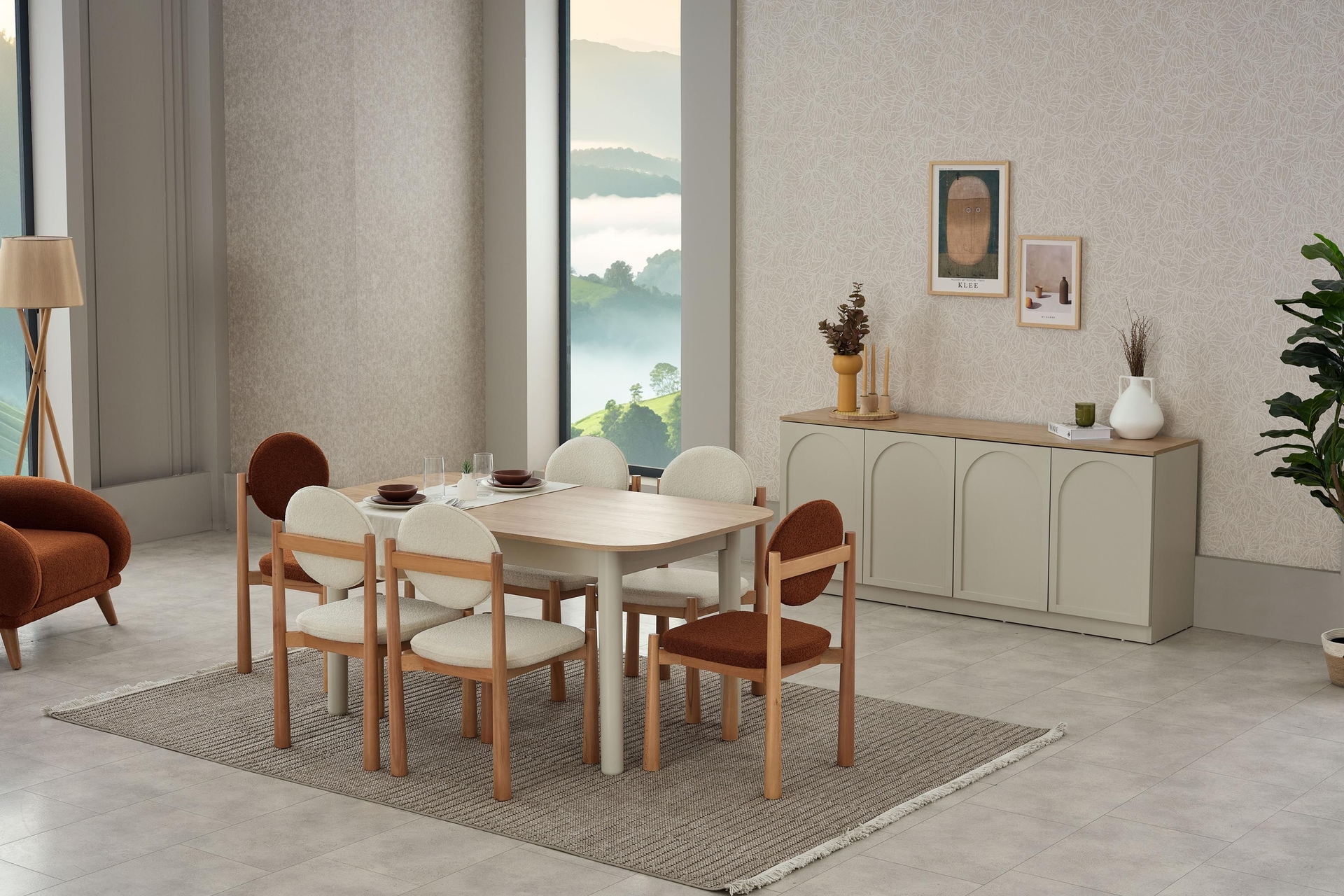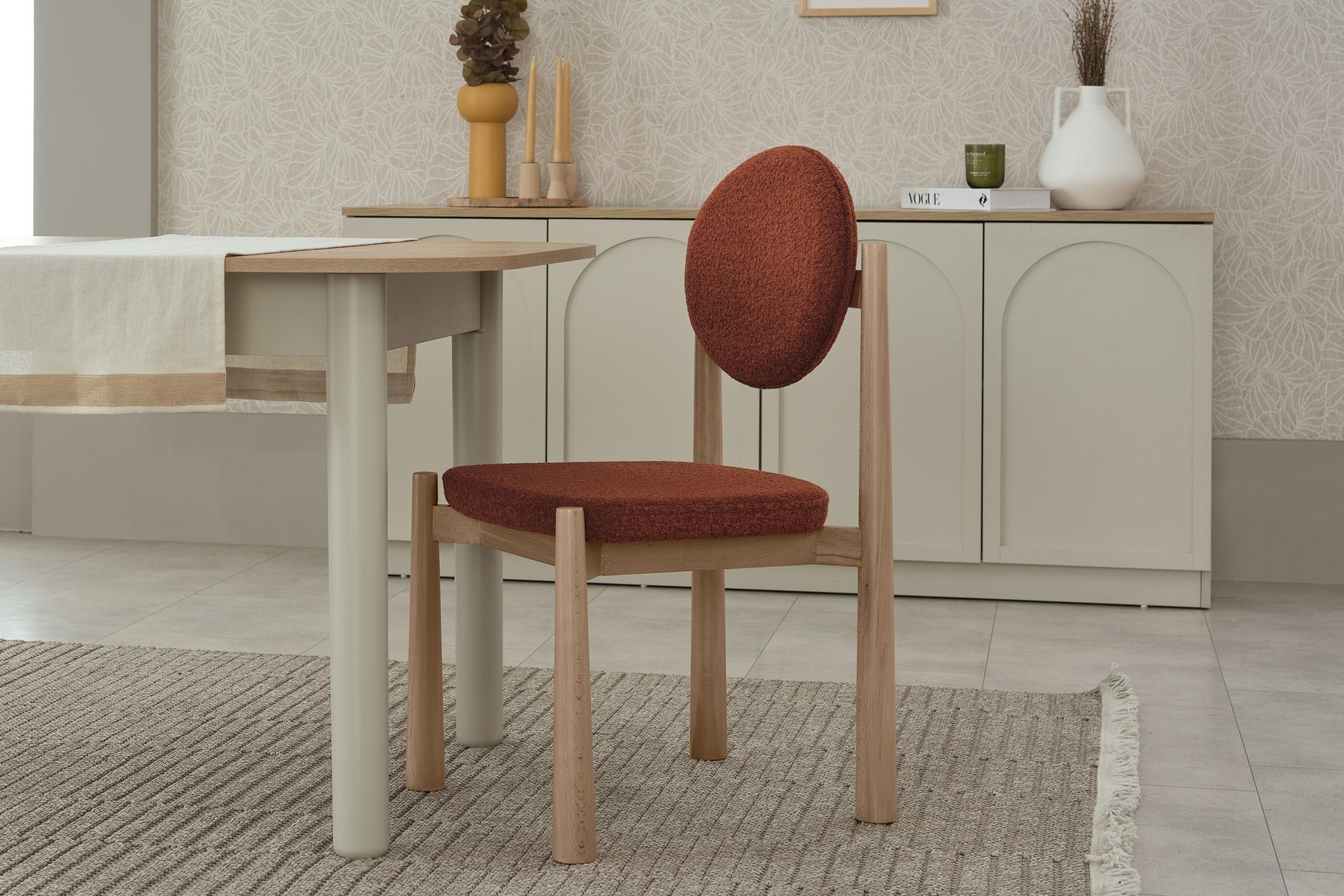 Capra Sandalye, tarçın rengiyle ve sırt destekli tasarımıyla öne çıkar. Bohem ve İskandinav stillerinin harmanlanması, modern ve konforlu bir atmosfer yaratır.