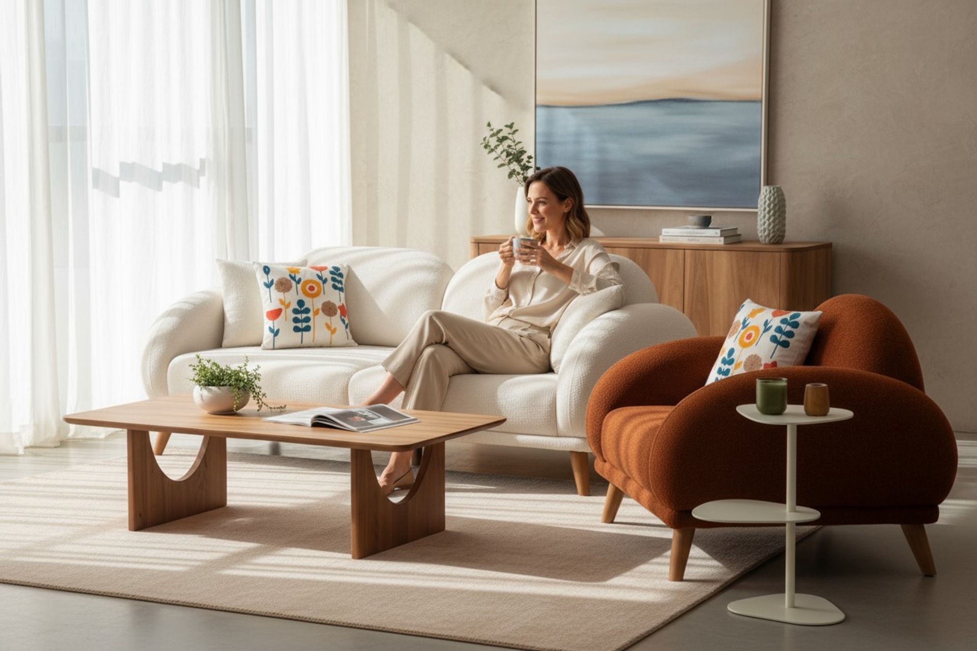 Capra Koltuk Takımı, turuncu berjer ve renkli kırlentlerle modern ve enerjik bir atmosfer yaratır. Turuncu, odada dikkat çekerken, renkli kırlentler de şıklığı ve hareketi artırır.