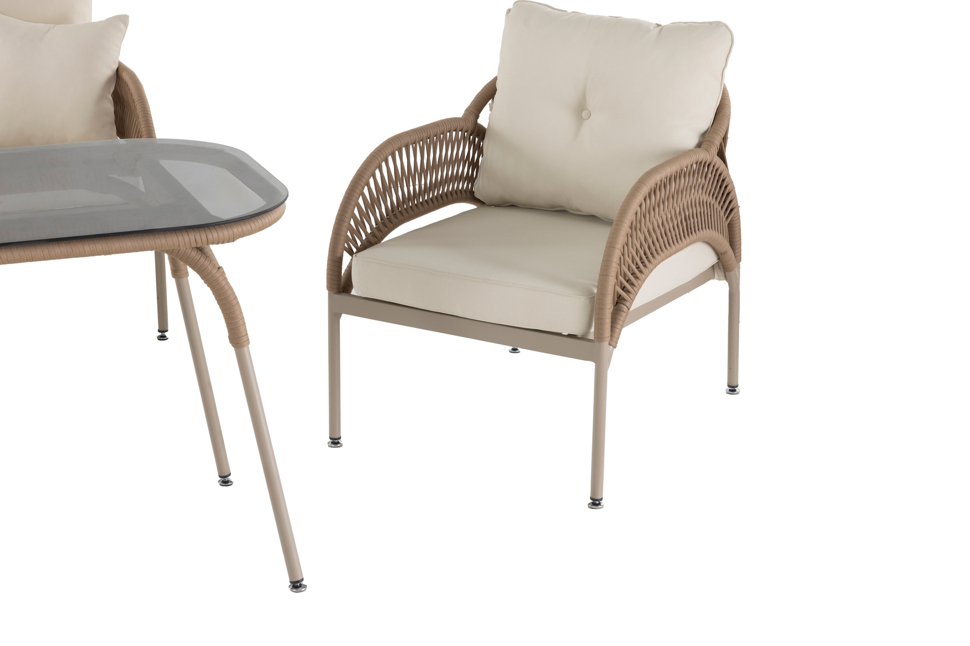 Ek BilgilerMalzemeler: Elyaf : Polipropilen veya Polietilen gibi poliolefinden yapılmış bir sentetik elyaftır. Döşemelik kumaş, ve içi mekânlarında kullanılır. Olefinin avantajları; lekelenmeye, küflenmeye, aşınmaya ve güneş ışığına karşı dayanıklıdır. Kumaş : Bahçe ve Balkon mobilyalarında, dış mekan şartlarına dayanıklı olefin içerikli malzemeden imal edilmiştir. Sünger : Oturum konforu sağlayan Yüksek yoğunlukta, soft özellikli poliüretan malzemeden imal edilmiştir. Outdoor ip: Dış mekan örgü teknolojisinde yeni bir soluk. Su geçirmez ve UV ışınlarına karşı dayanıklıdır. Kolay yıkanır leke tutmaz. Kopmaya ve tüylenmeye karşı dayanıklıdır. Metal Profil : Korozyona karşı dayanıklı ve dış mekânlarda uzun süre kullanım dayanımı sağlayan özel fırınlarda, elektrostatik boya işleminden geçirilmiş, yüksek kalitede metal malzemedir. Temperli Cam : Camın kırılmaya, erimeye ve çatlamaya dayanıklı hale getirilmesi amacıyla ısıl işlem uygulanmasına temperli cam denir.
