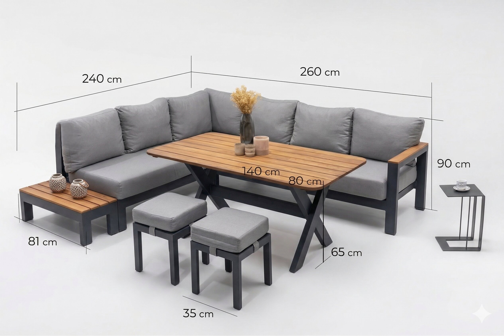 Ek BilgilerTakıma puflar dahildir. Oturum ve sırt minderleri fermuarlıdır. Sünger 32 DNS soft Sırt dolgu boncuk elyaf Masa tablasındaki ahşap kesimler farklılık gösterebilir. Outdoor ispanyol etisilk kumaş malzemeden üretilmiştir. Su itici özelliğe sahiptir. Profil kalınlığı 2,5 mm. Kullanılan ağaç malzemesi iroko ağacıdır. Kırlentler görsel amaçlı kullanılmıştır takıma dahil değildir. Kullanılan aksesuarlar görsel amaçlıdır.Takıma dahil değildir. C sehpa takıma dahil değildir.