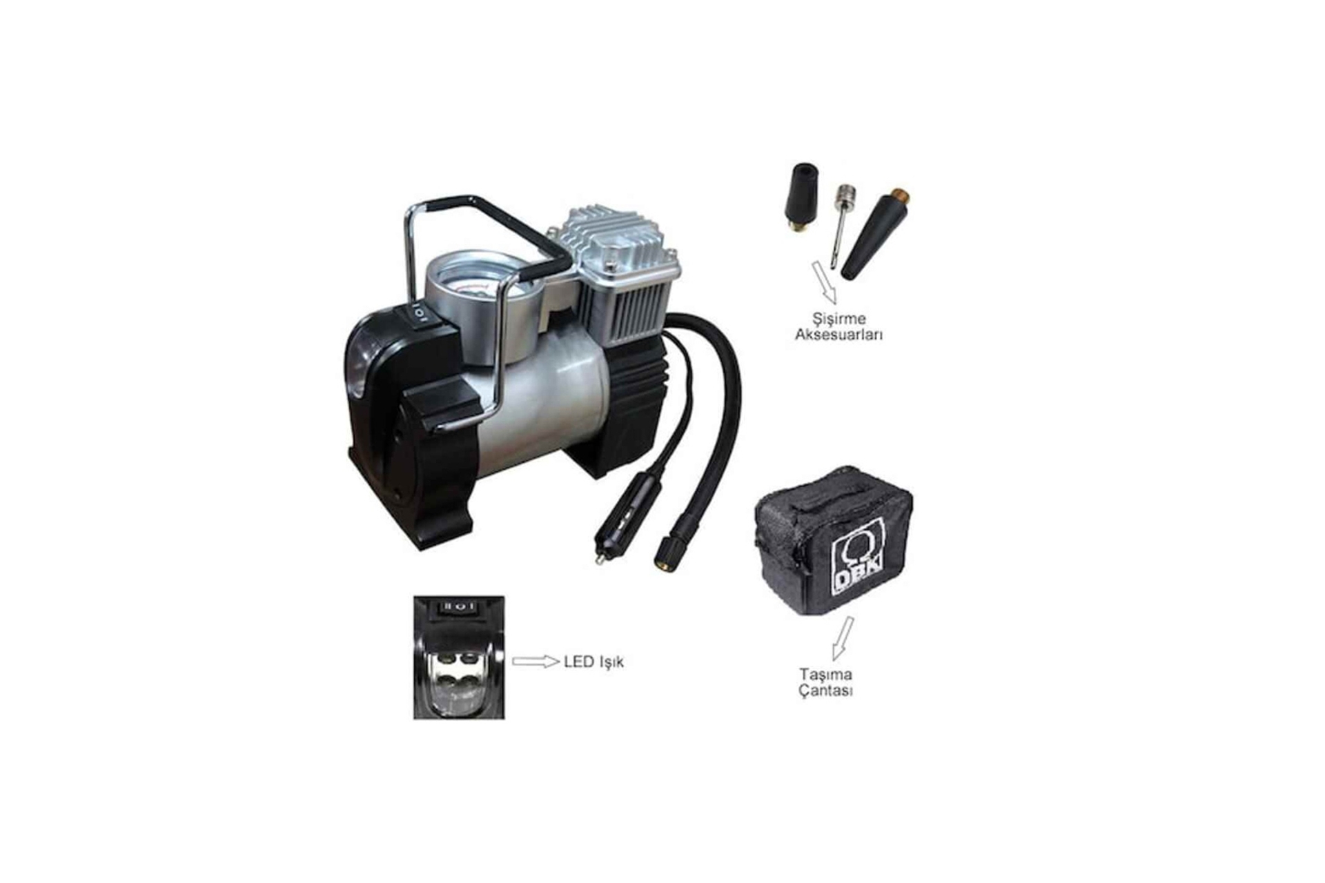 Ek BilgilerÜrün teknik özellikleri: · Giriş voltajı 12 v dc · Güç 120 w (10 a) · Max. Basınç 7 bar/100 psi · Kapasite 30 l/dk · Sigorta 15 a · Güç kablosu 3 m · Hava hortumu 77 cm