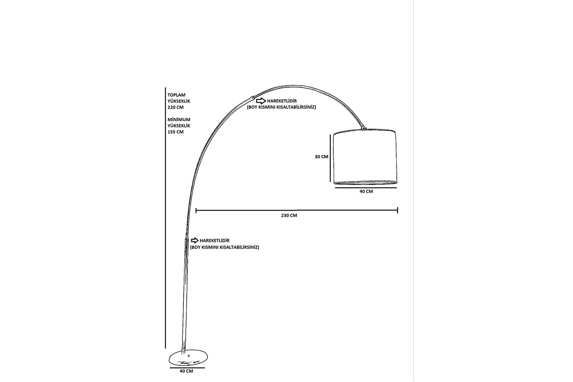Ek BilgilerÜRÜN ÖLÇÜLERİ: Ürün Ayak Çapı: 40 CM Yüksekliği: 220 CM Minimum Yükseklik: 155 CM Ürün Uzaklığı: 230 CM ÜRÜN ÖZELLİKLERİ: Ürün Başlık Ve Gövde Kısımları Mafsalıdır Yukarı-Aşşağı Hareket Ettirebilirsiniz Ürün Metaldan Üretilmiştir Statik Fırın Boyalıdır Mat Krom Kaplamalıdır Ürün Ara Fuar Kablosu TSE Onaylıdır Aç-Kapa Şeklindedir Duy Tipi E27 Max 60W