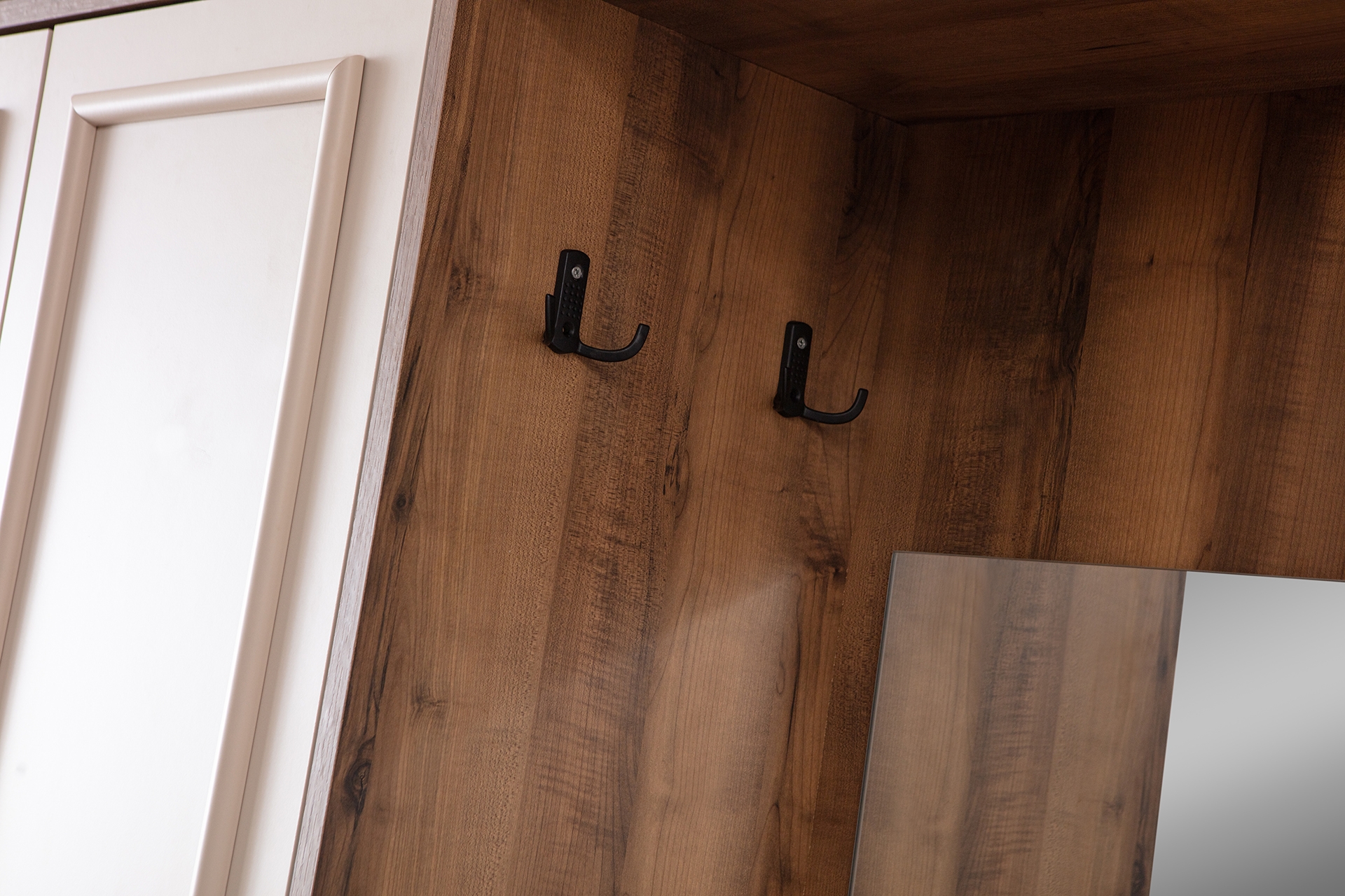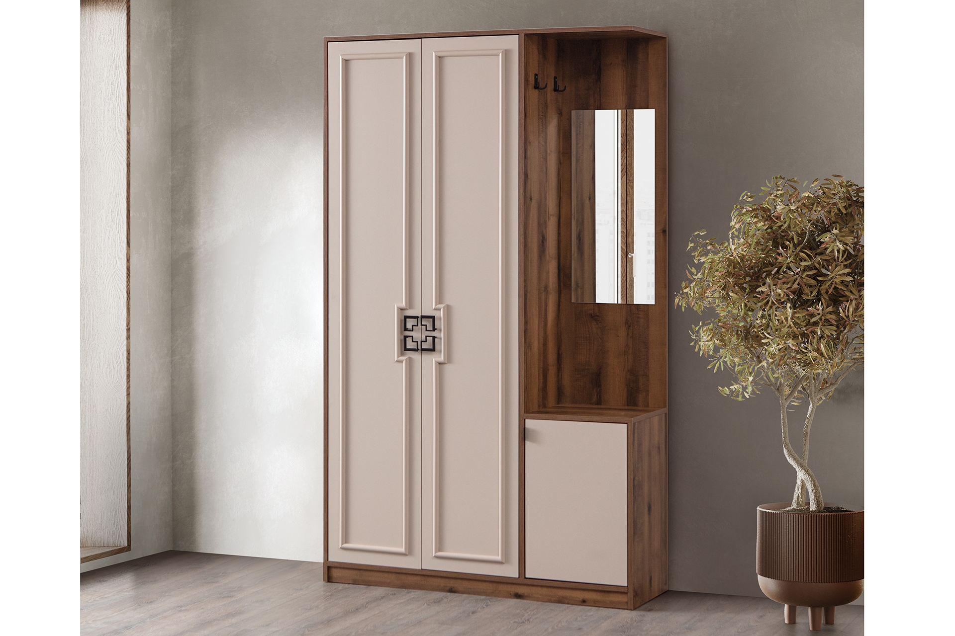 Ek BilgilerFersa Aynalı Portmanto 1. Sınıf Melamin Kaplı Yonga Levha malzemeden üretilmiştir. Birleştirme aksesuarları olarak minifix ve kavela kullanılmıştır. Üzerinde bulunan vizon renk dekor, MDFLAM üzeri PVC kaplamadır. Ürün Kapaklarında frensiz menteşe kullanılmıştır. Kulp materyalleri alüminyum olup mat siyah renktedir. Ürün Vizyon rengindedir. Ürün aynalıdır Ürün Kurulu Ölçüleri :Genişlik : 123 cm Yükseklik : 208 cm Derinlik: 38 cm
