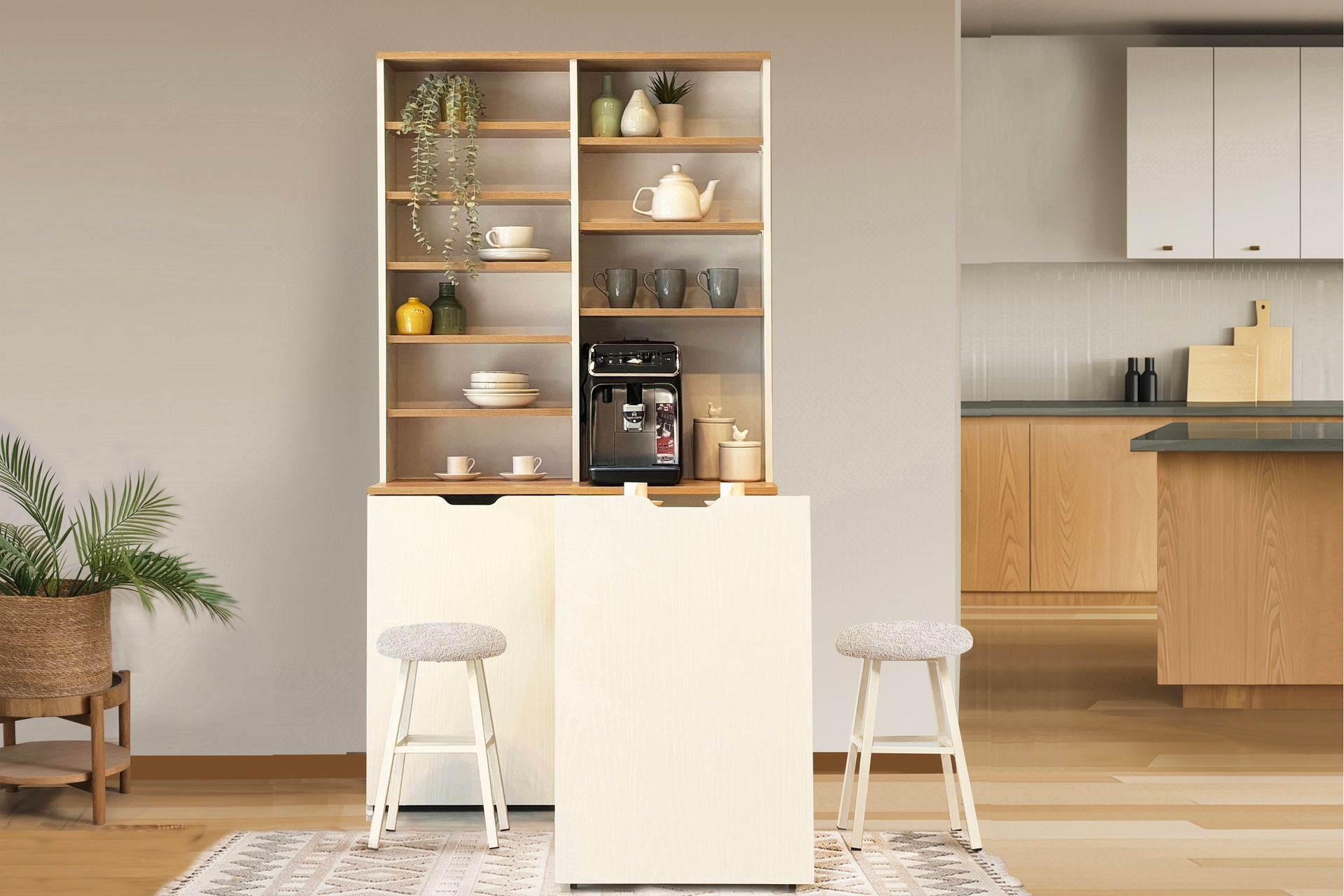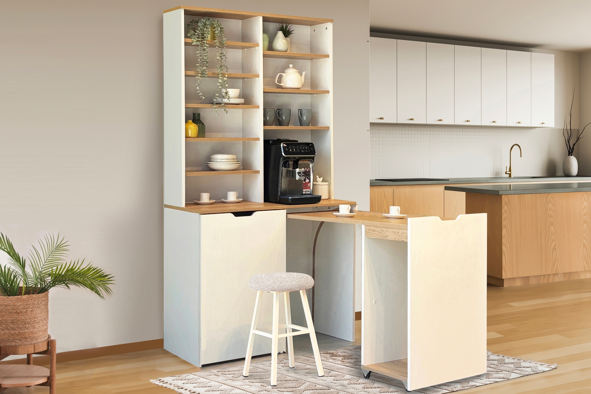 Ek BilgilerMutfağınızda hem şık hem de işlevsel bir alan yaratmak istiyorsanız, ön tarafında açılır-kapanır masası bulunan bu kahve köşesi tam size göre. Kullanılmadığında kolayca kapatılarak yer kazandırır; ihtiyaç duyulduğunda ise pratik bir şekilde açılarak ekstra kullanım alanı sunar. Özellikle küçük mutfaklarda alanı verimli kullanmayı sağlar ve zarif tasarımıyla dekoratif bir dokunuş katar. Bu sayede hem düzenli bir görünüm sağlanır hem de kullanım kolaylığı sunar.Ek olarak alableceğiz ürüne özel tasarlanmış 2 tabure ise masanın altına kolayca yerleştirilebilir. Bu sayede hem düzenli bir görünüm sağlanır hem de kullanım kolaylığı sunar. MASA KAPALI : 100X190X45 cm MASA AÇIK : 100X190X144 cm MASA ÖLÇÜSÜ : 47X75X97 cm