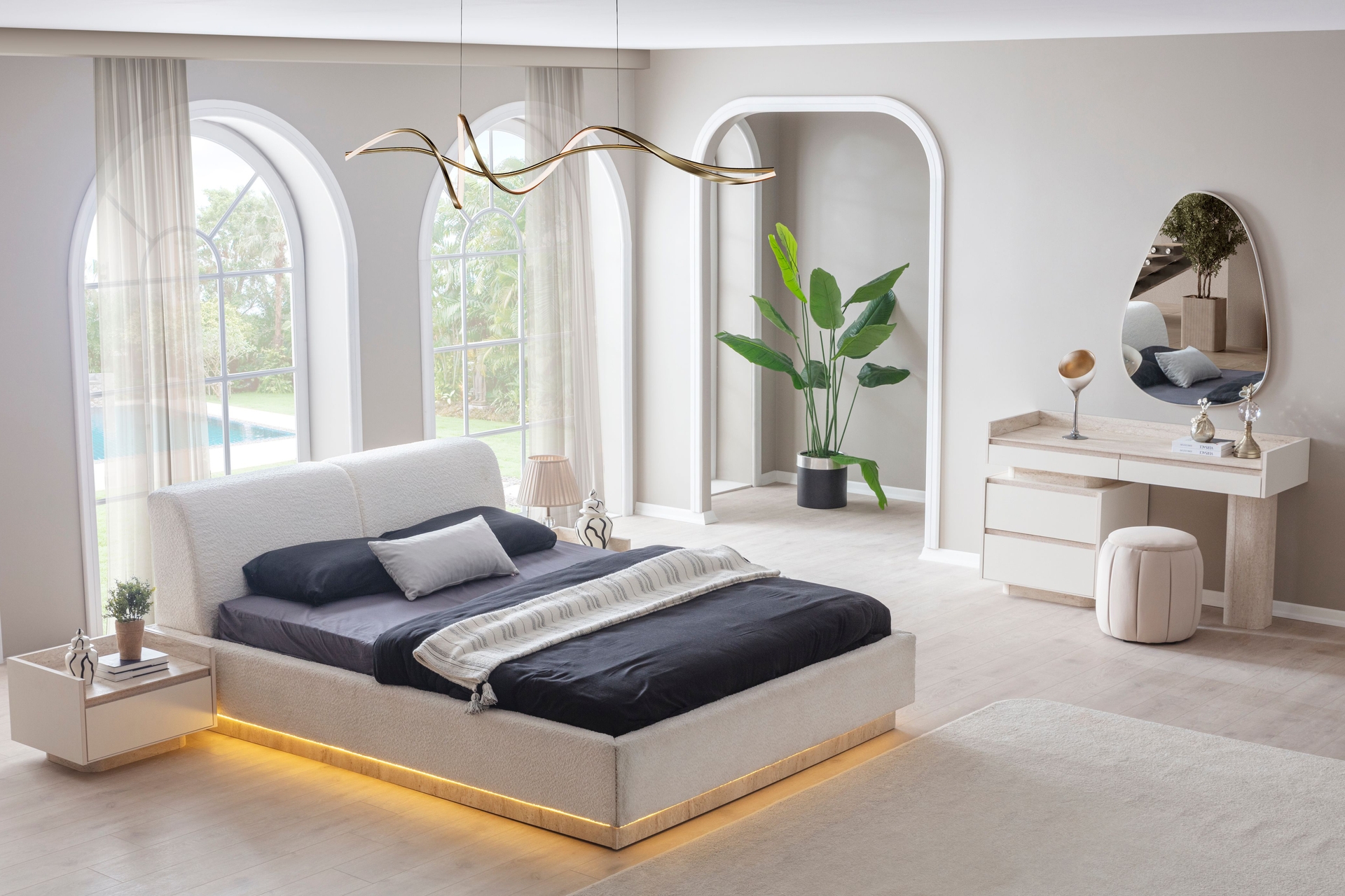 Takım İçeriğiGARDIROP- BAZALI KARYOLA - 2 KOMODİN - ŞİFONYER VE AYNA