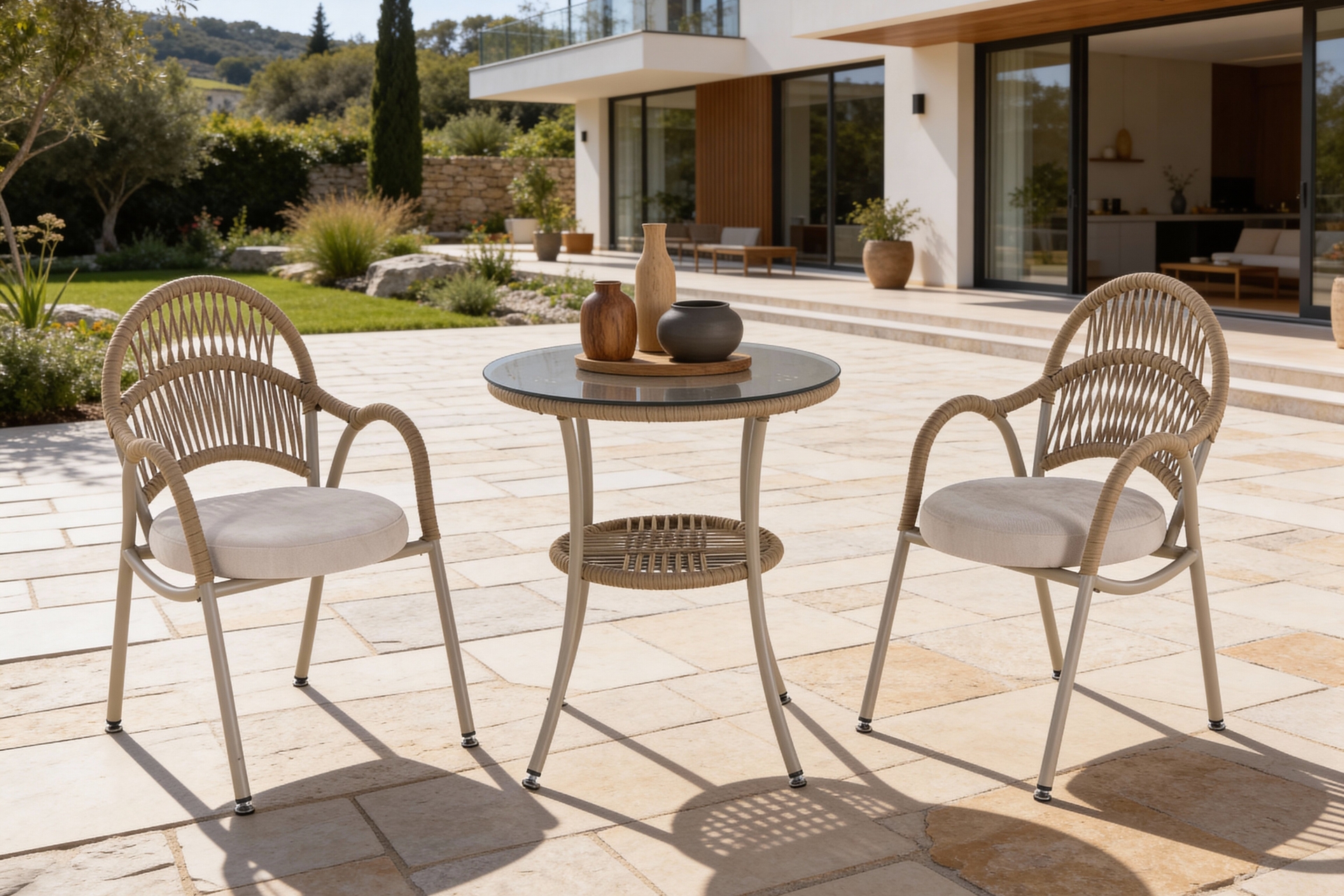 Ek BilgilerMalzemeler: Elyaf : Polipropilen veya Polietilen gibi poliolefinden yapılmış bir sentetik elyaftır. Döşemelik kumaş, ve içi mekânlarında kullanılır. Olefinin avantajları; lekelenmeye, küflenmeye, aşınmaya ve güneş ışığına karşı dayanıklıdır. Kumaş : Bahçe ve Balkon mobilyalarında, dış mekan şartlarına dayanıklı olefin içerikli malzemeden imal edilmiştir. Sünger : Oturum konforu sağlayan Yüksek yoğunlukta, soft özellikli poliüretan malzemeden imal edilmiştir. Outdoor ip: Dış mekan örgü teknolojisinde yeni bir soluk. Su geçirmez ve UV ışınlarına karşı dayanıklıdır. Kolay yıkanır leke tutmaz. Kopmaya ve tüylenmeye karşı dayanıklıdır. Metal Profil : Korozyona karşı dayanıklı ve dış mekânlarda uzun süre kullanım dayanımı sağlayan özel fırınlarda, elektrostatik boya işleminden geçirilmiş, yüksek kalitede metal malzemedir. Temperli Cam : Camın kırılmaya, erimeye ve çatlamaya dayanıklı hale getirilmesi amacıyla ısıl işlem uygulanmasına temperli cam denir.