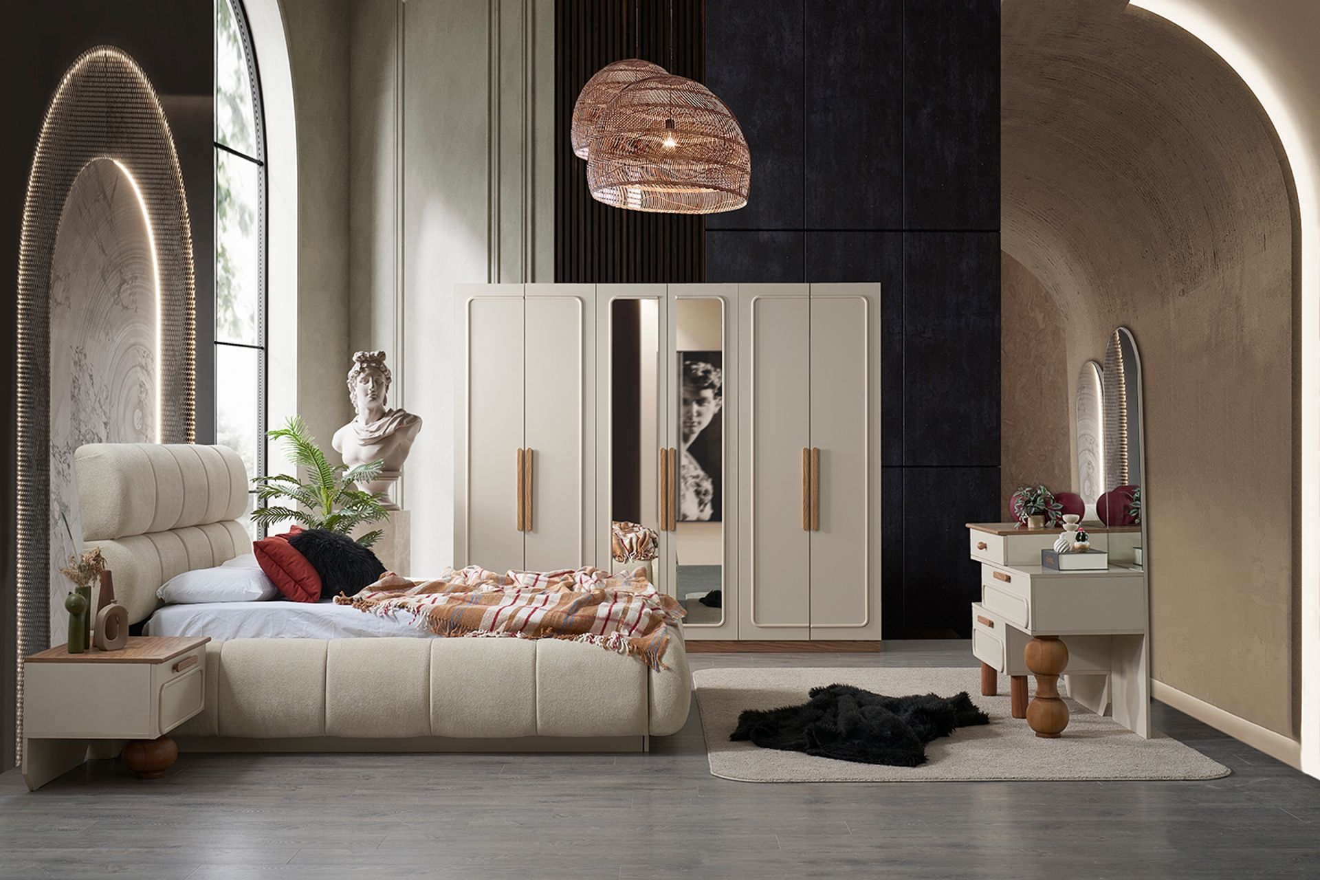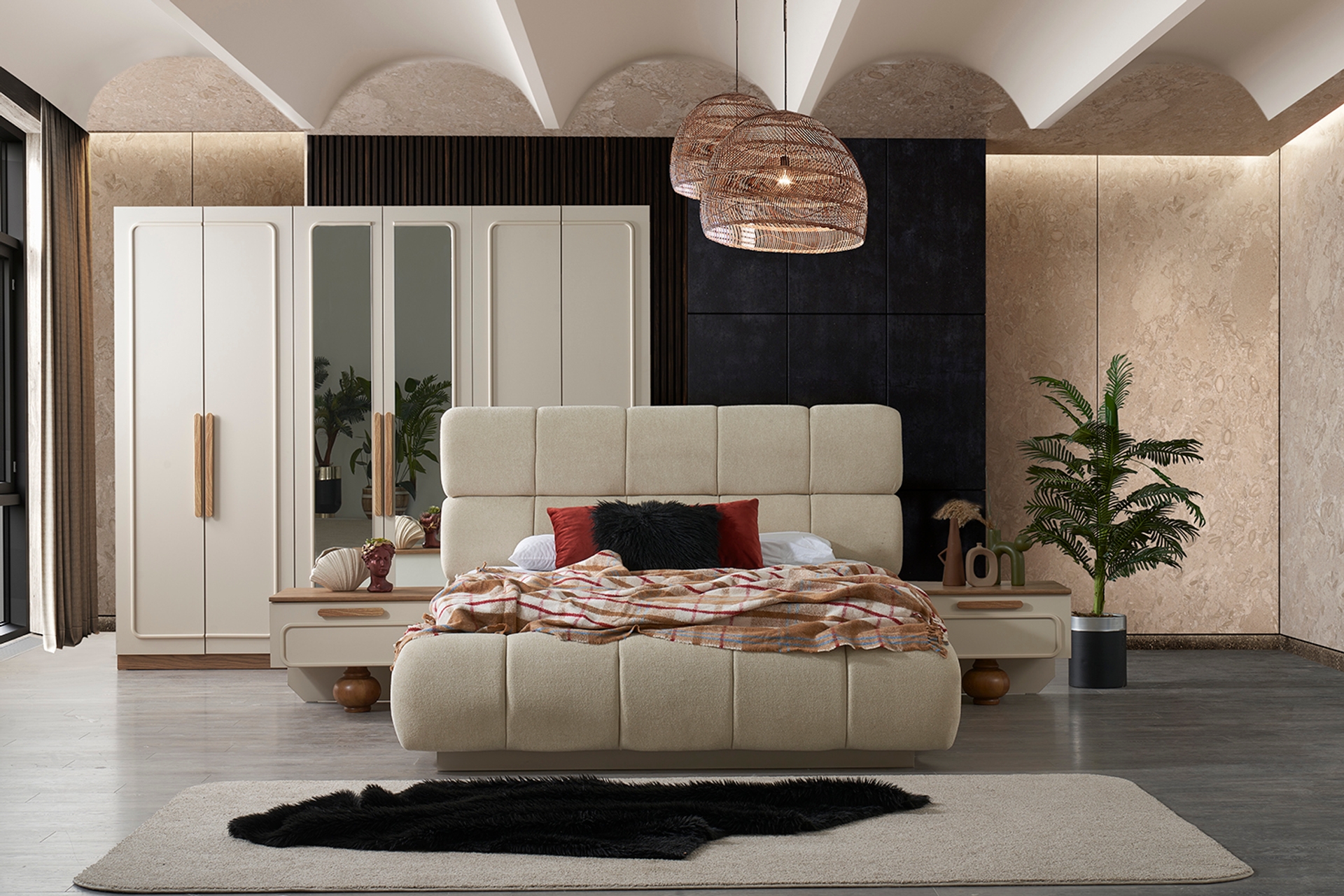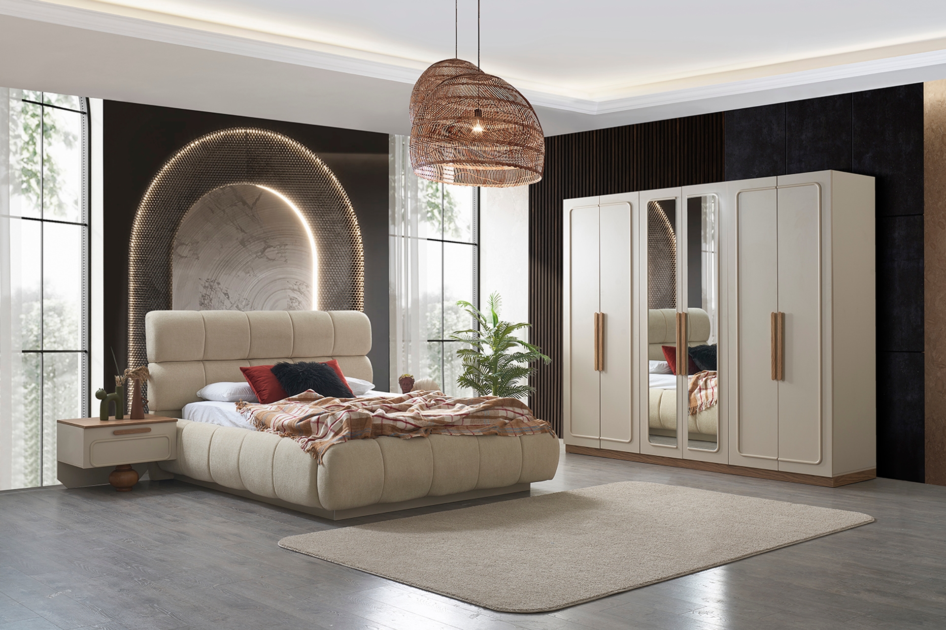 Takım İçeriği1 ADET DOLAP, 1ADET ŞİFONER, 1 ADET ŞİFONYER BOY AYNA, 1 ADET ŞİFONYER KÜÇÜK AYNA, 2 ADET KOMODİN, 1 ADET BAZALI KARYOLA