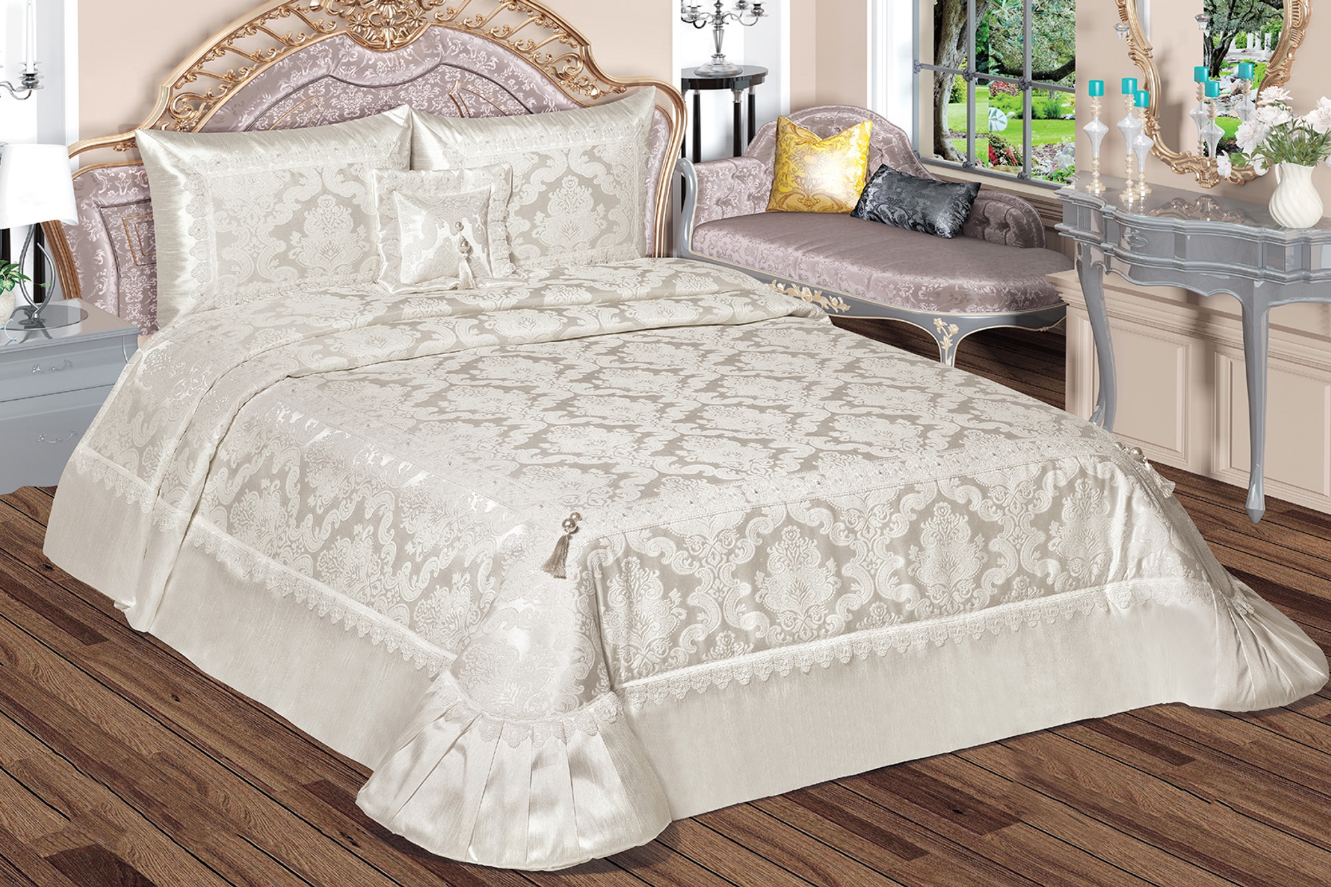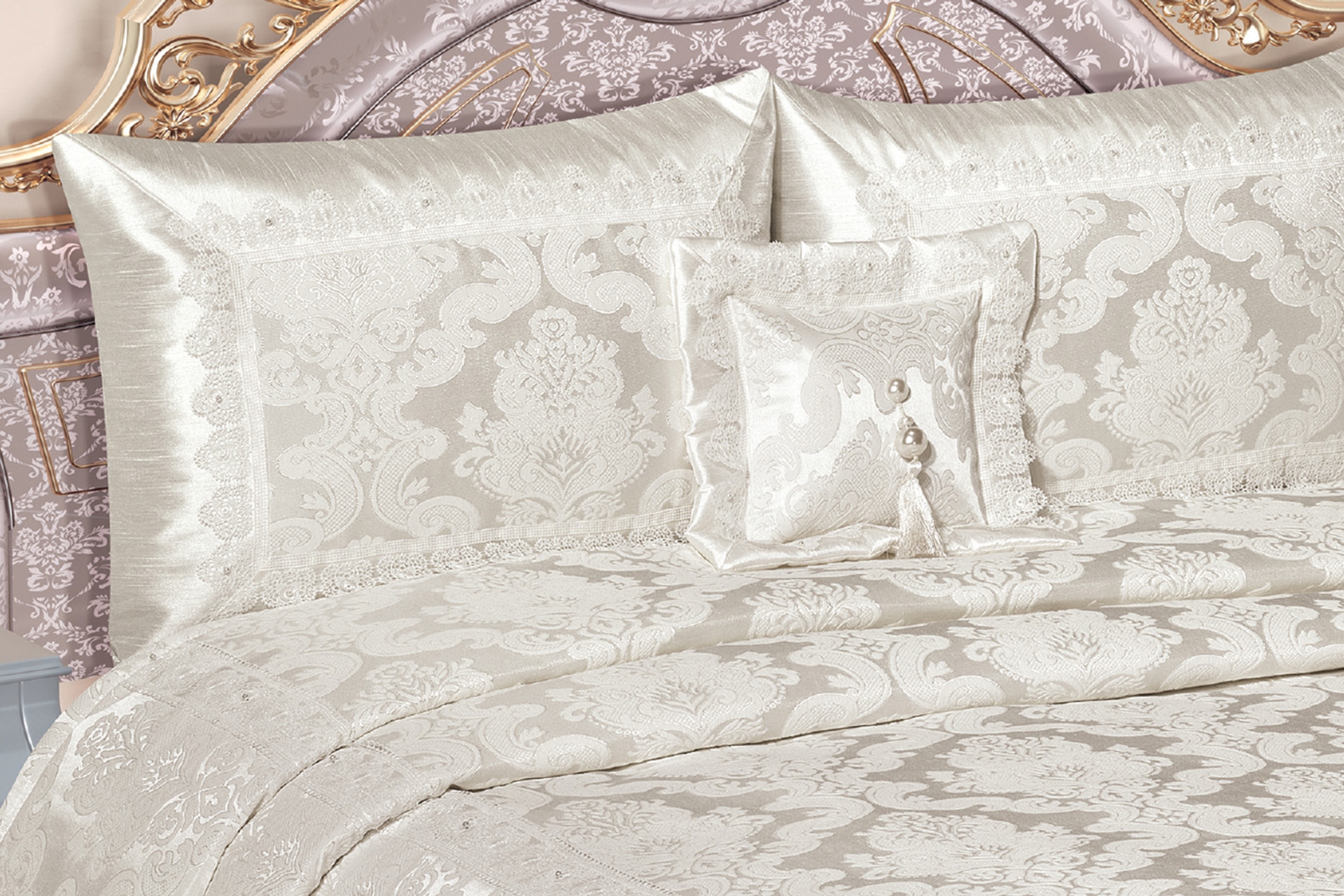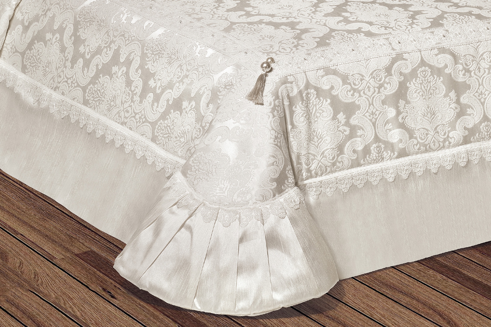 Ek BilgilerSet 4 Parçadan oluşmaktadır. Yatak örtüsü astarlı ve iç dolgusu 1.kalite termo elyaf dolguludur (180gr/m2) ÜRÜN ÖLÇÜLERİ : Yatak Örtüsü: 270*260 cm (1 Adet) Yastık Kılıfı : 50*70 (2 Adet) Süs Yastığı : (1 adet) Yatak örtüsü fransız danteli ile süslenmiştir. Ürün yüzeyi pamuktur. Dört tarafı saten kumaş ile detaylandırılmıştır. Aksesuar olarak inci ve taşlar dikilmiştir. 4 mevsim kullanım için uygundur. PAKETLEME Özel sert kutu ambalajında gönderilecektir. Kesinlikle kargoda zarar görmeyecek şekilde ambalajlanacaktır. Kanserojen ve alerjenik maddeler içermez. Cildi tahriş etmez ve insan sağlığına zarar vermez. Akmazlık testleri yapılmıştır ve üründe renk akma problemi ile karşılaşılmaz. ISO-9001 kalite standartlarında üretilmiştir.
