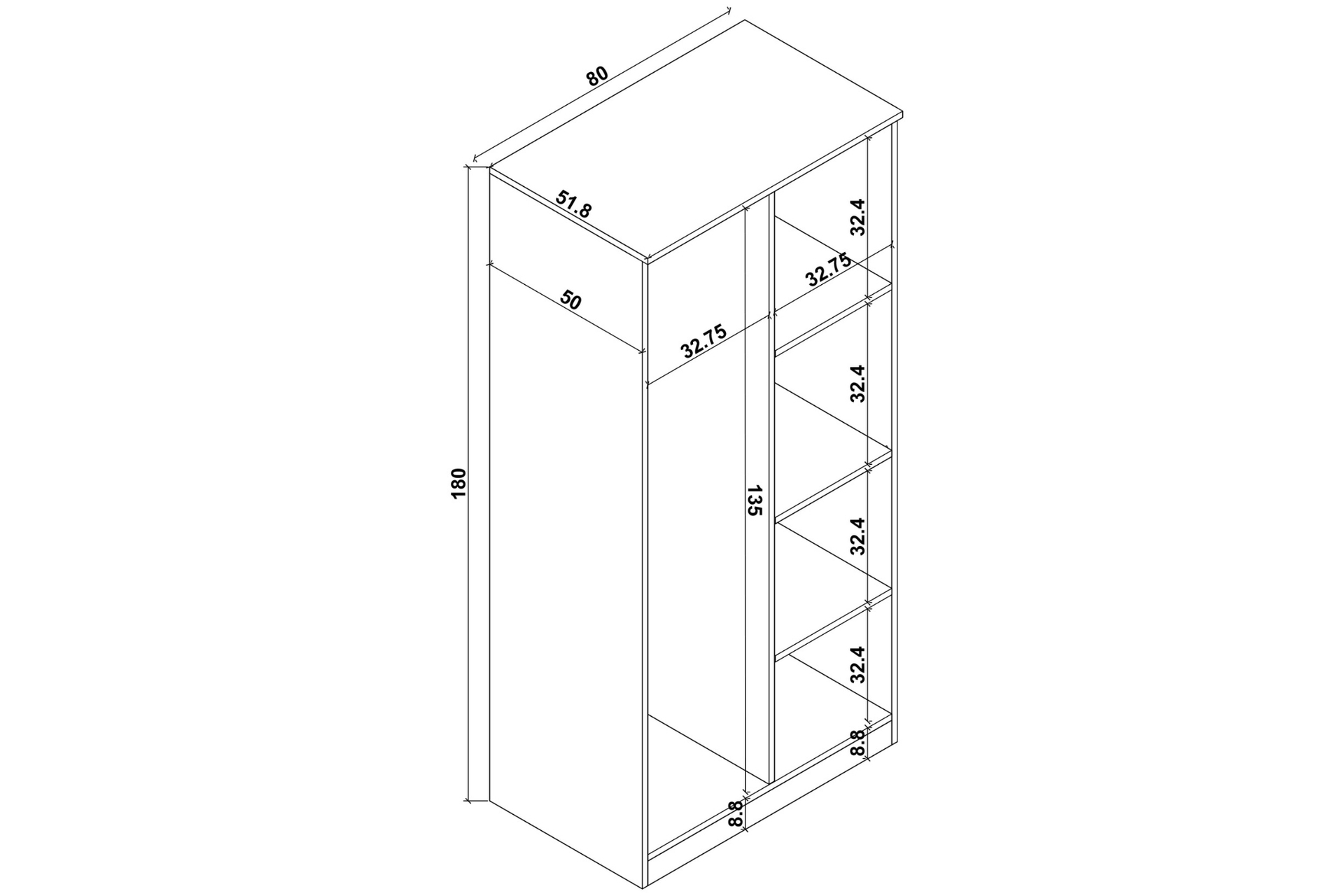 ÖlçüÜrün Ölçüleri: Genişlik: 80 cm Derinlik: 51.8 cm Yükseklik: 180 cm