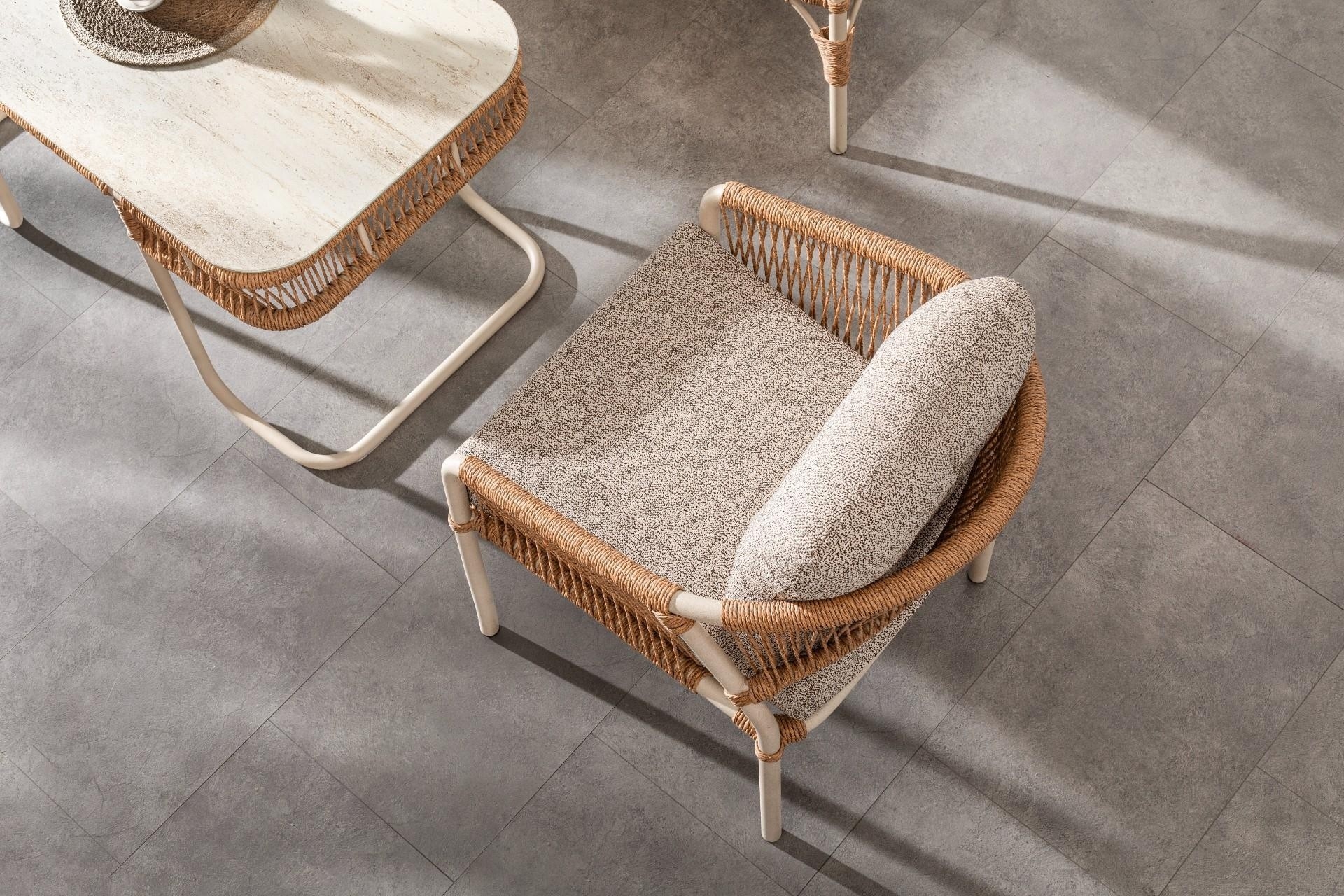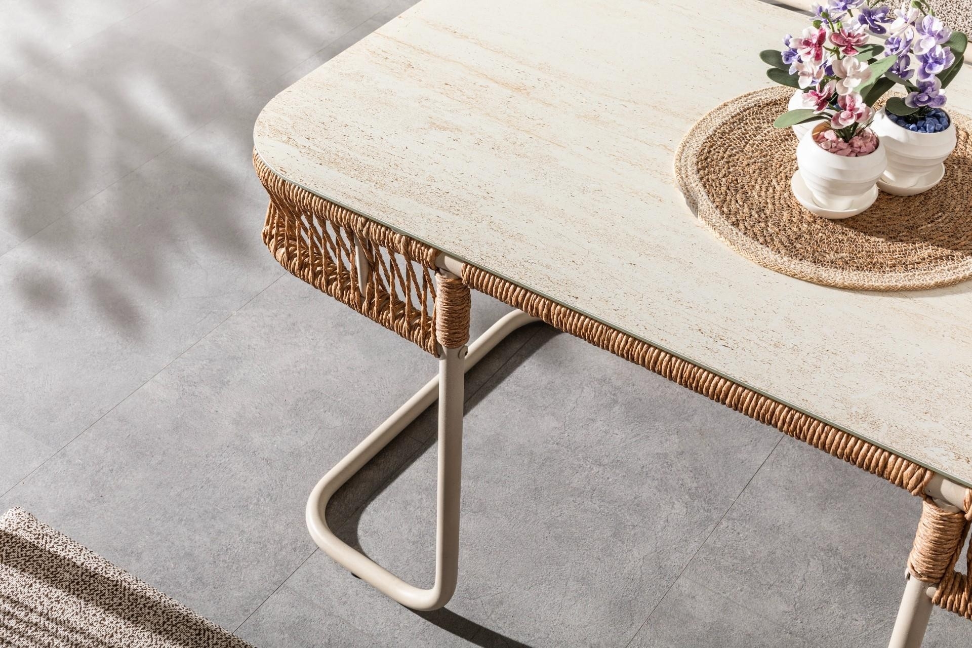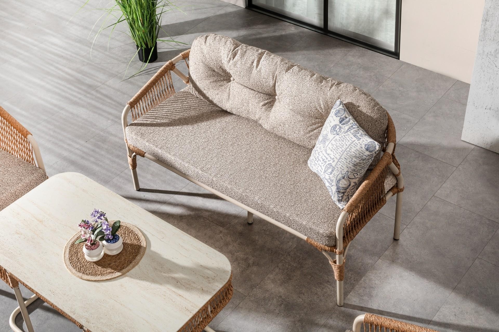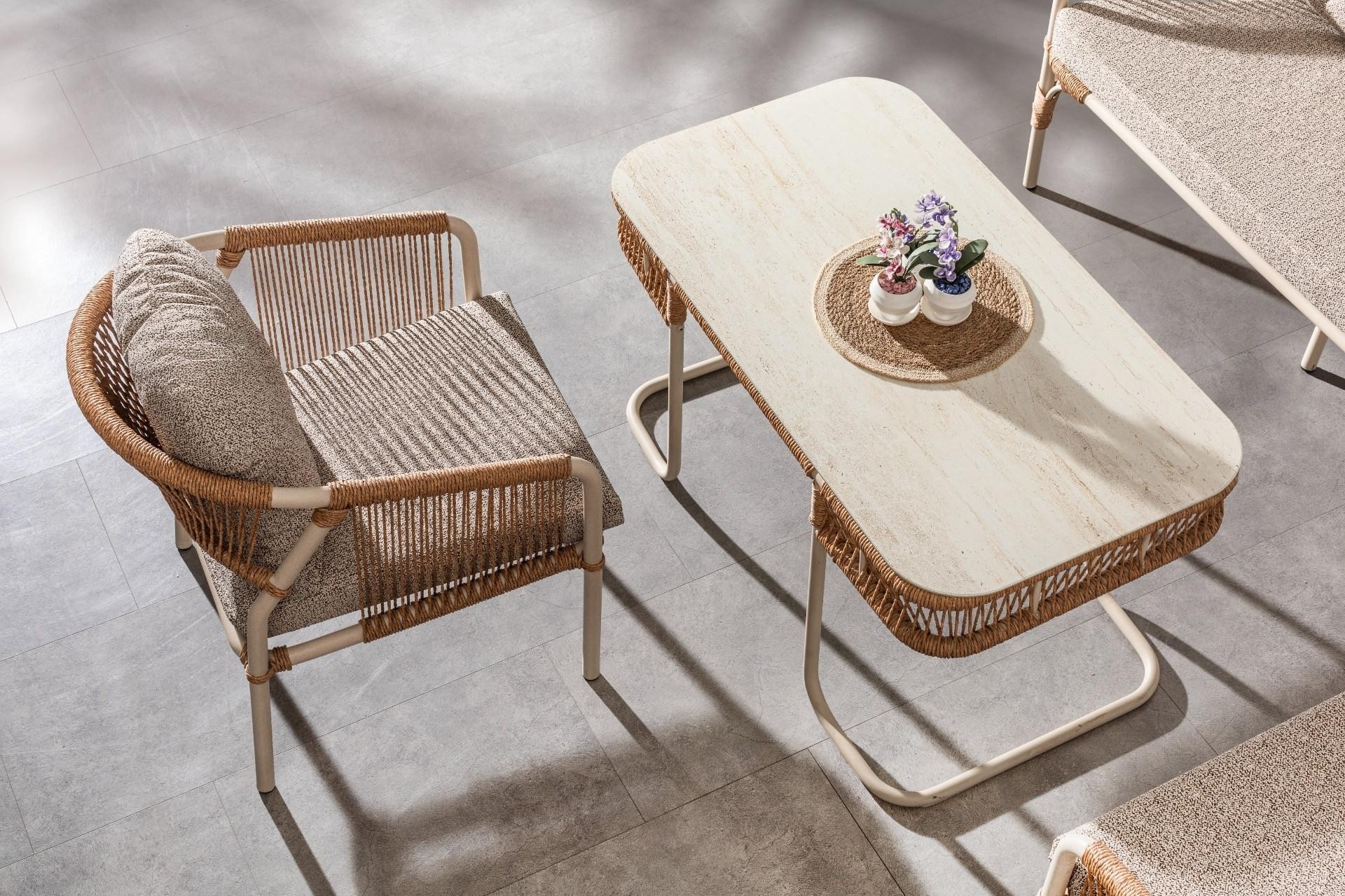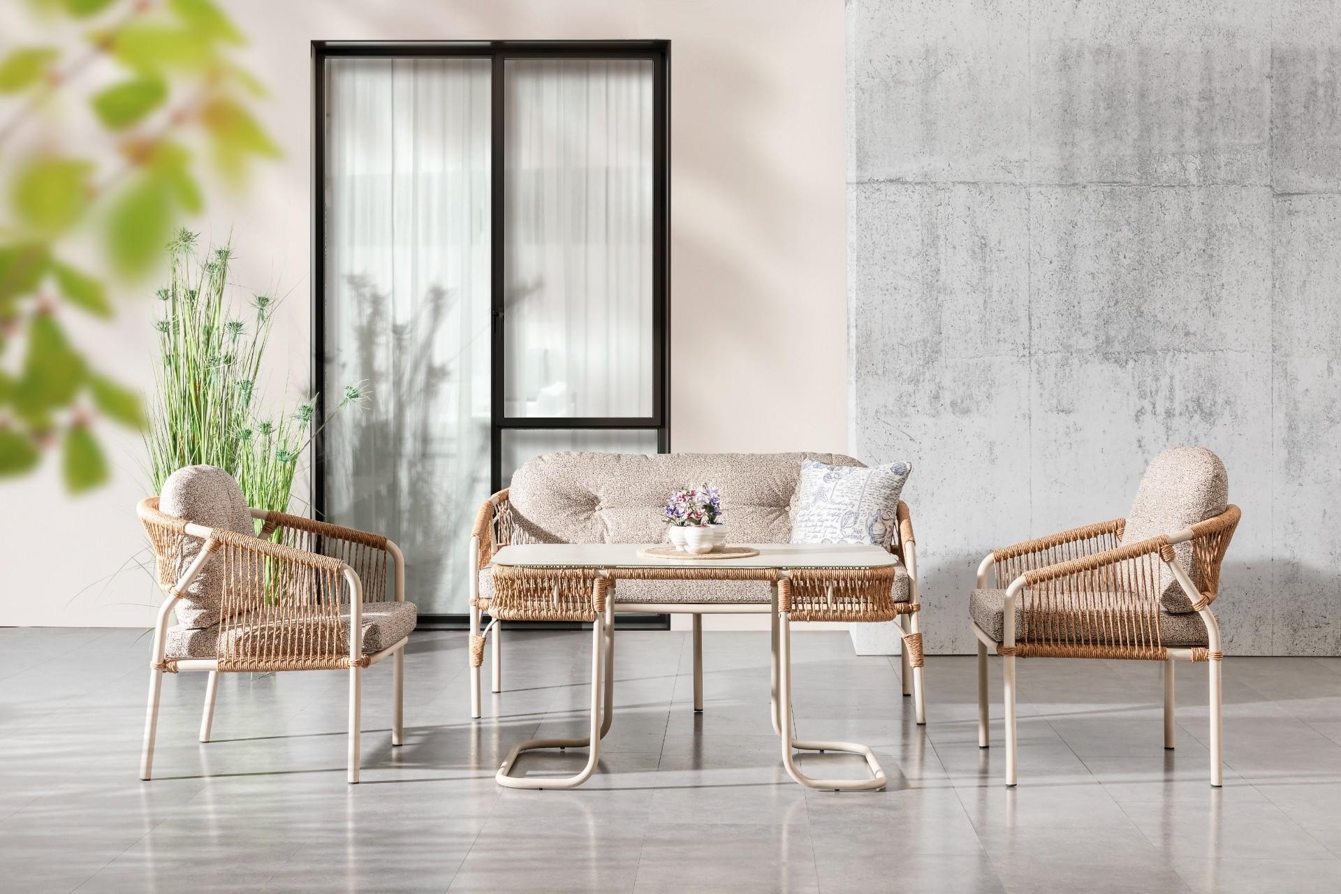 Ek BilgilerUzun Ömürlü ve Dayanıklı Malzeme ana gövdesi, paslanmaya karşı dirençli elektrostatik toz boyalı alüminyum malzemeden üretilmiştir. Bu sayede takım, yıllarca ilk günkü görünümünü koruyarak kullanım ömrünü uzatır. Dört Mevsim Kullanım İçin Özel Tasarım Lüks dış mekân mobilyaları için özel olarak üretilen Luxio Cord Outdoor ipleri, suya ve UV ışınlarına dayanıklılığı ile her mevsim sorunsuz bir kullanım sunar. Yıkanabilir ve hava koşullarına karşı dayanıklı yapısı sayesinde güneş, yağmur ve nem gibi dış etkenlerden etkilenmez. Konforu Ön Planda Tutan Minderler Oturma grubunda kullanılan minderler, 32 DNS yoğunlukta olup uzun süreli oturumlarda dahi konfor sunar. Su itici ve leke tutmaz özellikteki kumaş kaplaması, minderlerin temiz ve bakımlı kalmasını kolaylaştırır.