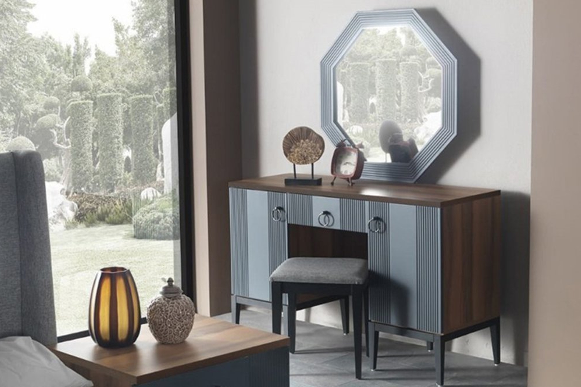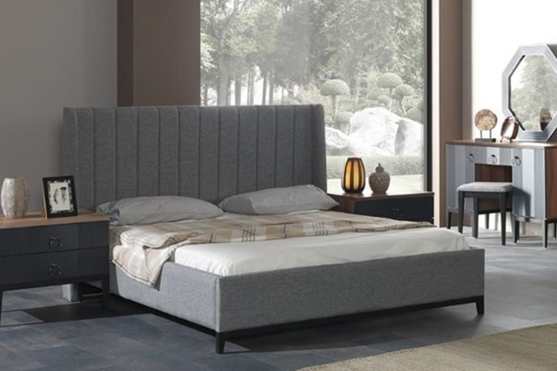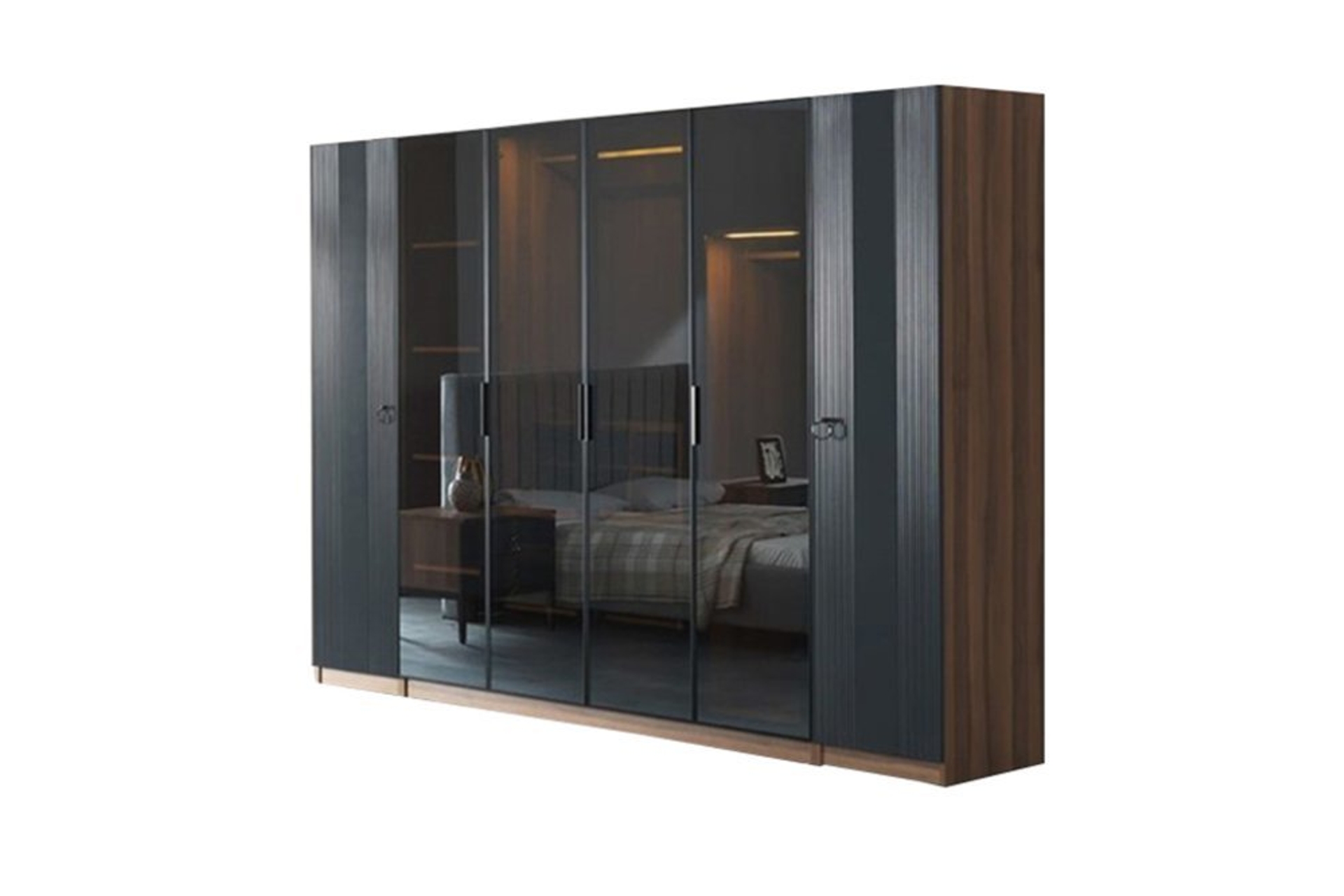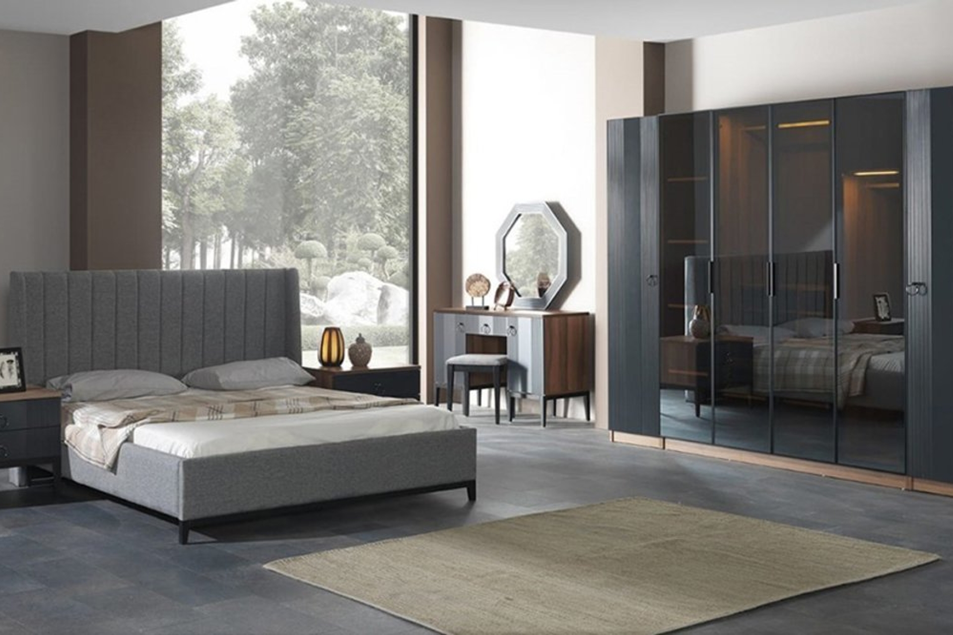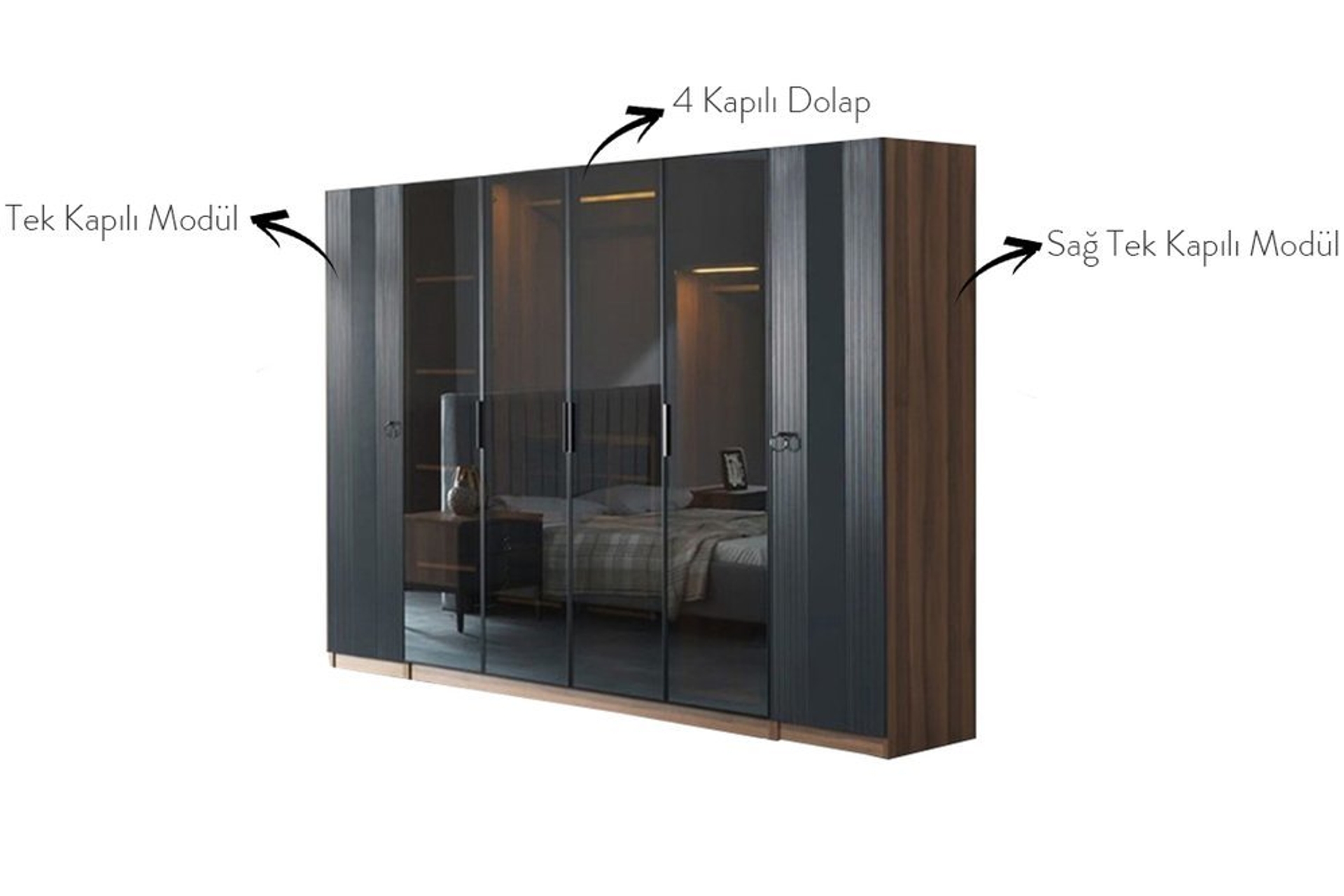 Takım İçeriği1 adet 4 kapaklı Dolap, sağ tek kapılı modül, sol tek kapılı modül, 1 bazasız karyola, 1 şifonyer ve aynası ve 2 adet komodinden oluşmaktadır.