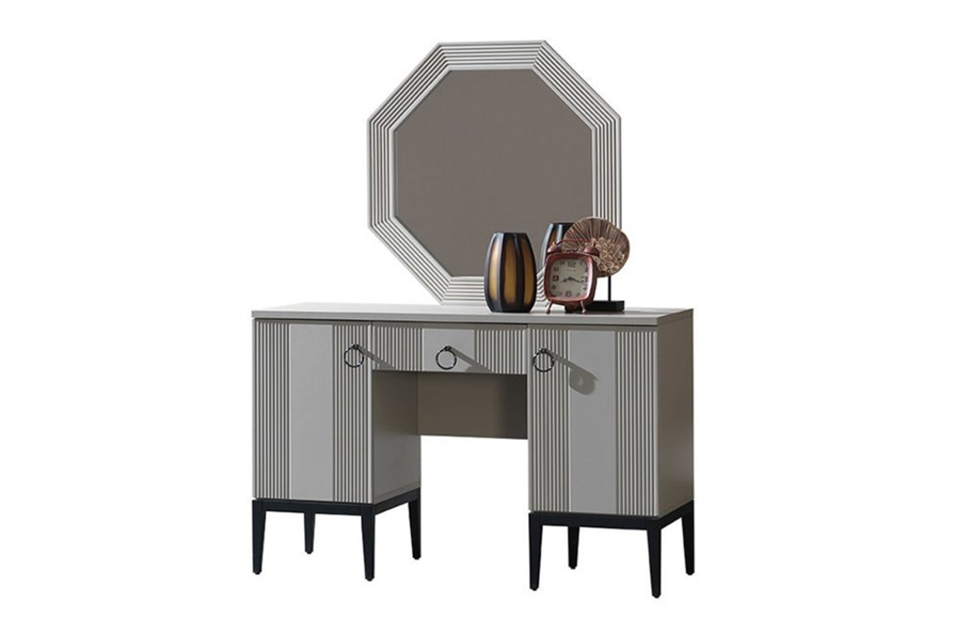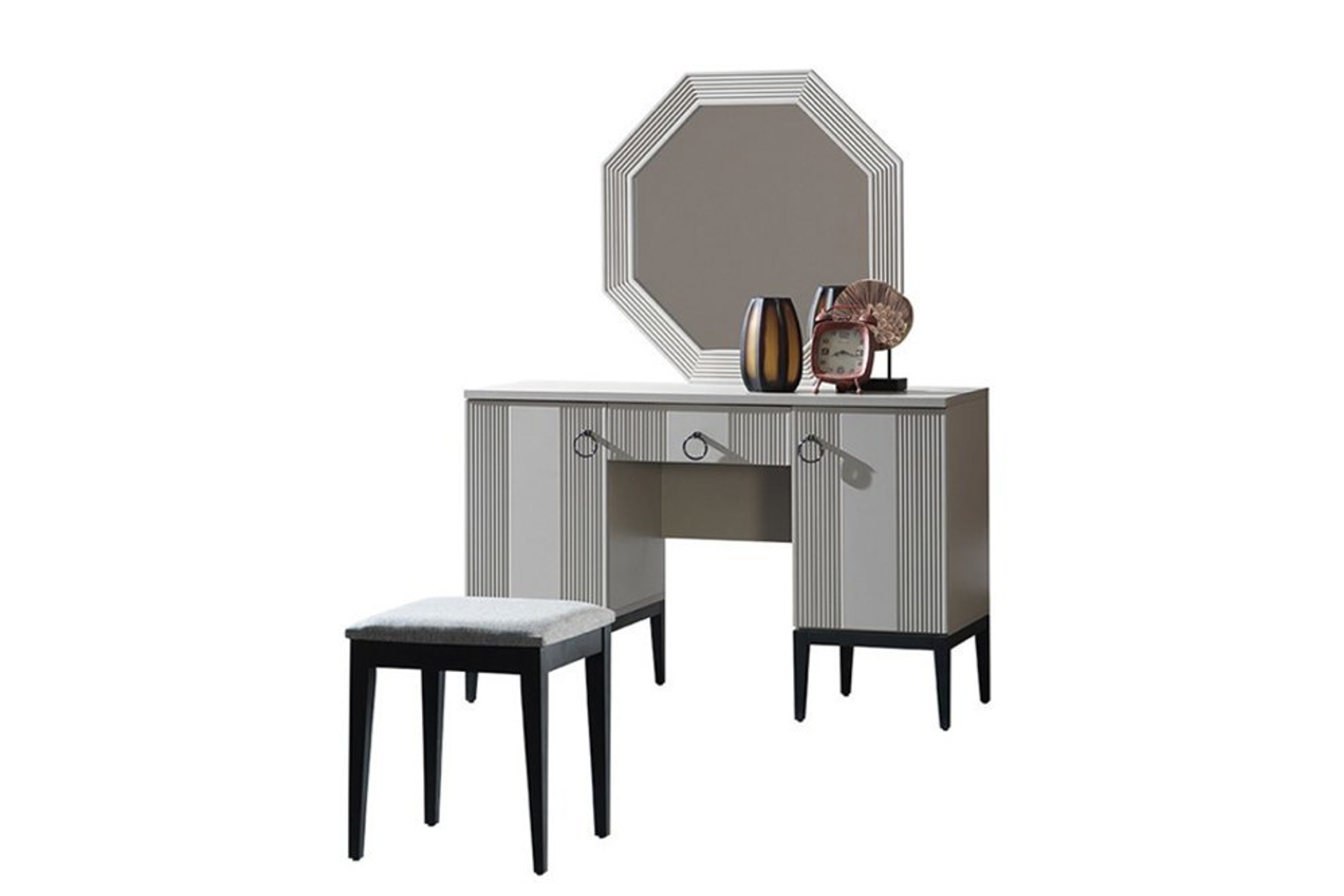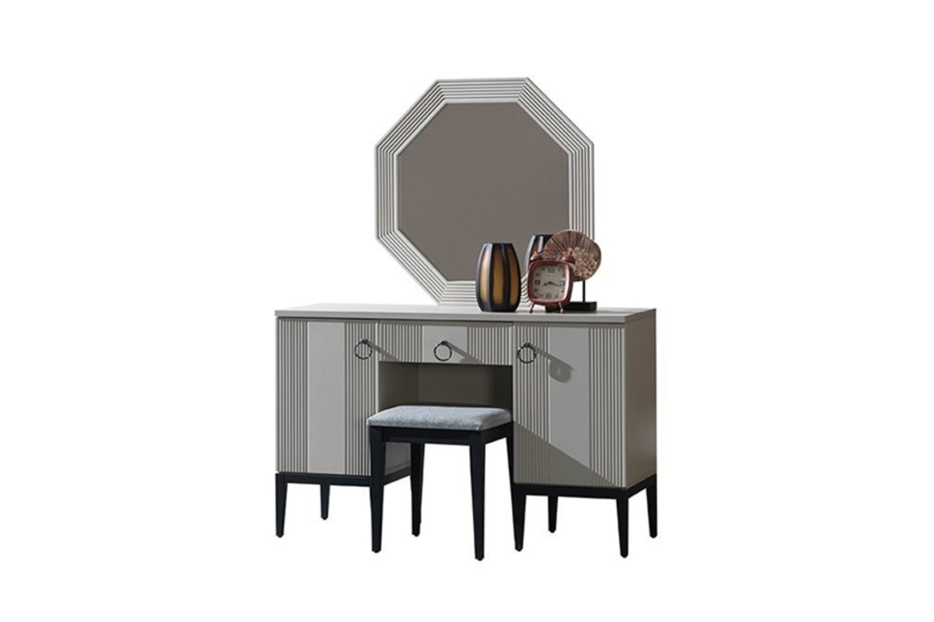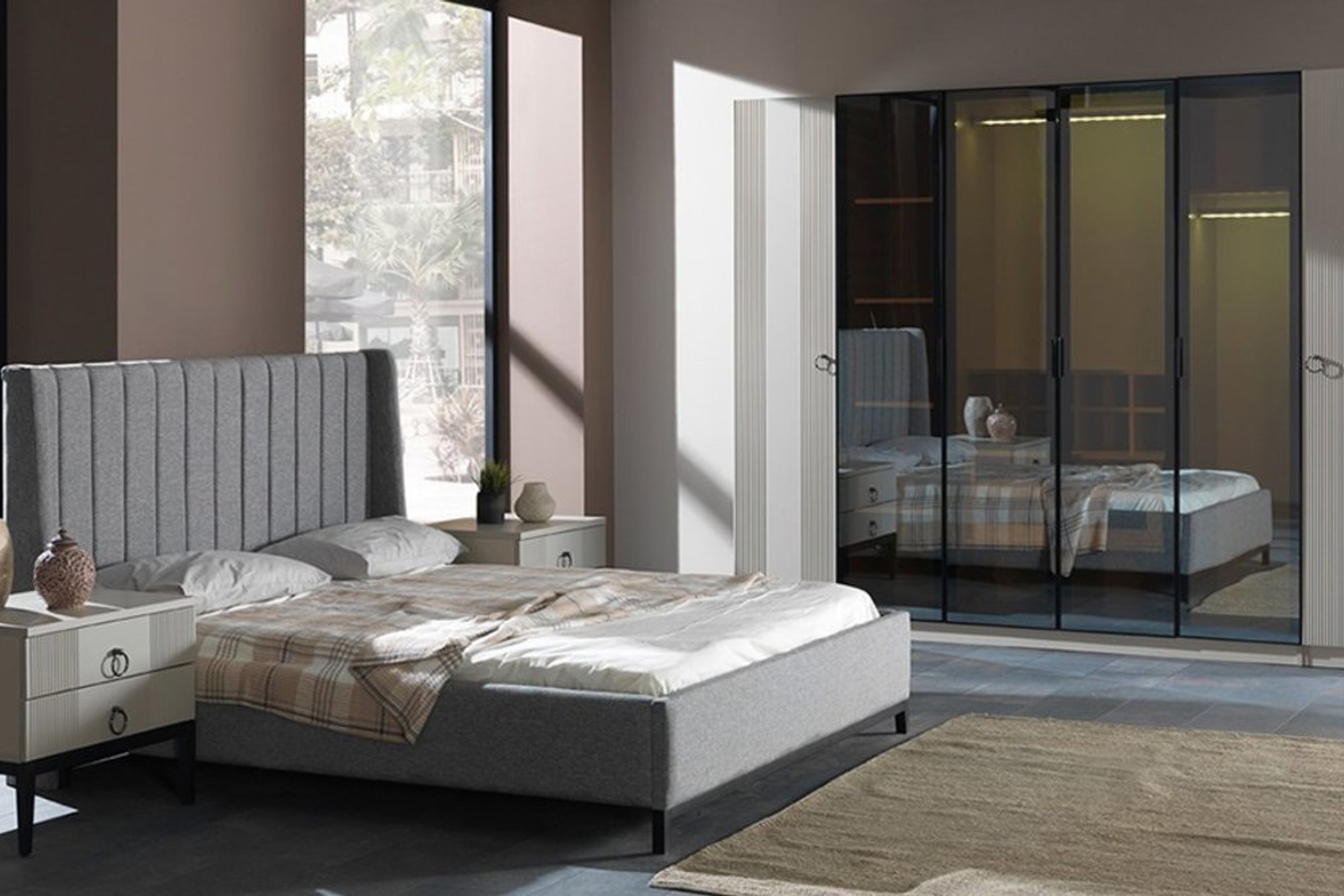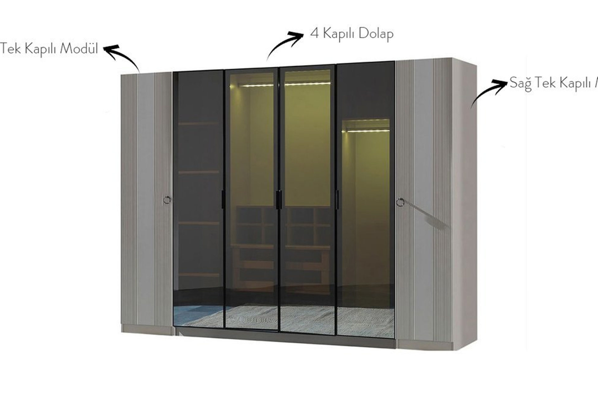 Takım İçeriği1 adet 4 kapaklı Dolap, sağ tek kapılı modül, sol tek kapılı modül, 1 bazasız karyola, 1 şifonyer ve aynası ve 2 adet komodinden oluşmaktadır.