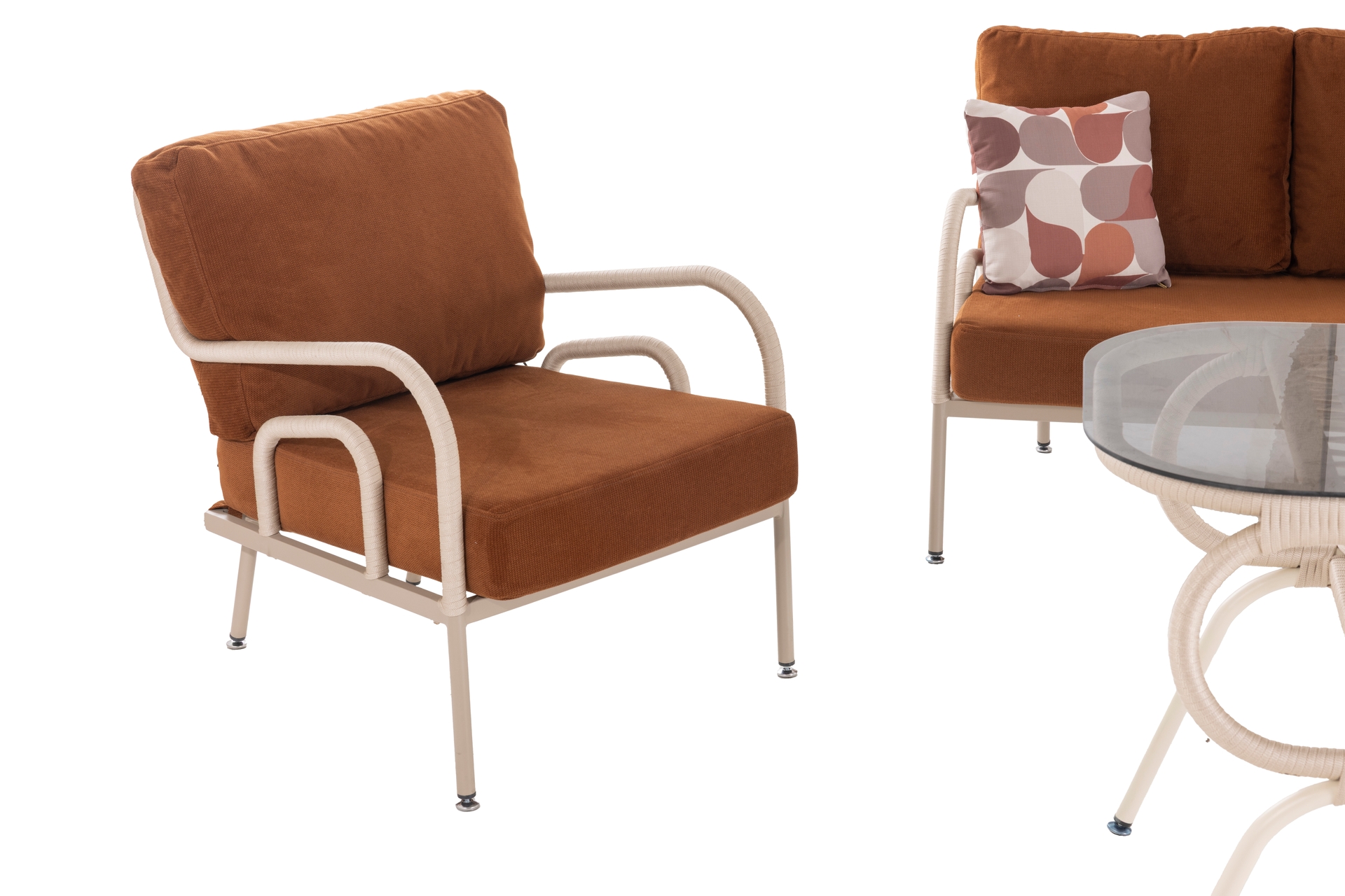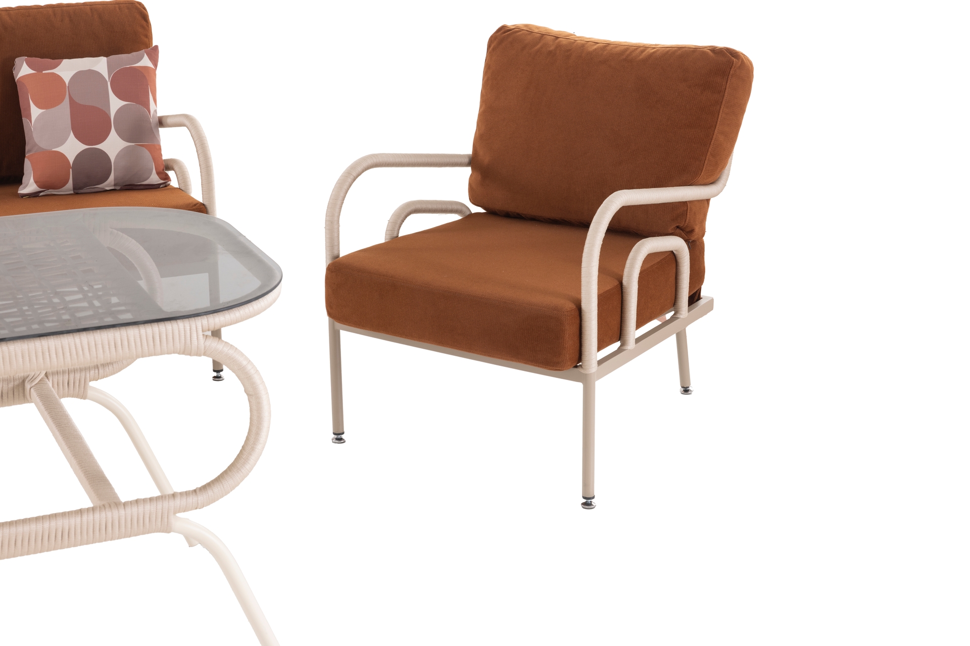 Ek BilgilerMalzemeler: Elyaf : Polipropilen veya Polietilen gibi poliolefinden yapılmış bir sentetik elyaftır. Döşemelik kumaş, ve içi mekânlarında kullanılır. Olefinin avantajları; lekelenmeye, küflenmeye, aşınmaya ve güneş ışığına karşı dayanıklıdır. Kumaş : Bahçe ve Balkon mobilyalarında, dış mekan şartlarına dayanıklı olefin içerikli malzemeden imal edilmiştir. Sünger : Oturum konforu sağlayan Yüksek yoğunlukta, soft özellikli poliüretan malzemeden imal edilmiştir. Outdoor ip: Dış mekan örgü teknolojisinde yeni bir soluk. Su geçirmez ve UV ışınlarına karşı dayanıklıdır. Kolay yıkanır leke tutmaz. Kopmaya ve tüylenmeye karşı dayanıklıdır. Metal Profil : Korozyona karşı dayanıklı ve dış mekânlarda uzun süre kullanım dayanımı sağlayan özel fırınlarda, elektrostatik boya işleminden geçirilmiş, yüksek kalitede metal malzemedir. Temperli Cam : Camın kırılmaya, erimeye ve çatlamaya dayanıklı hale getirilmesi amacıyla ısıl işlem uygulanmasına temperli cam denir.