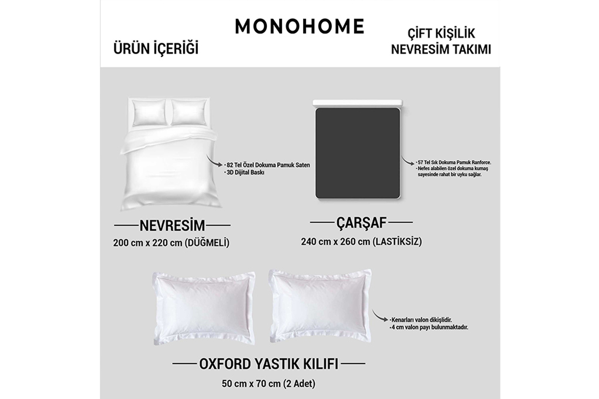 Ek Bilgiler1 adet çarşaf, 1 adet nevresim kılıfı ve 2 adet yastık kılıfından oluşmaktadır.