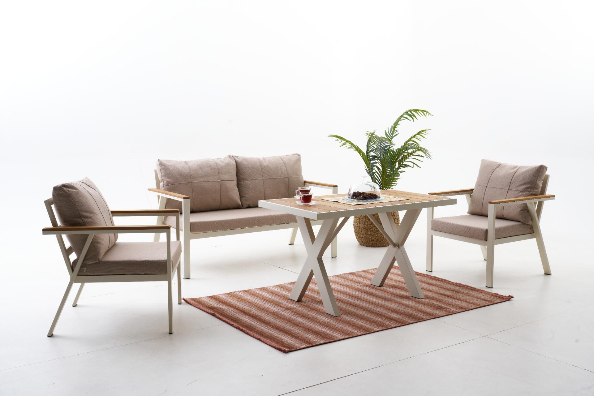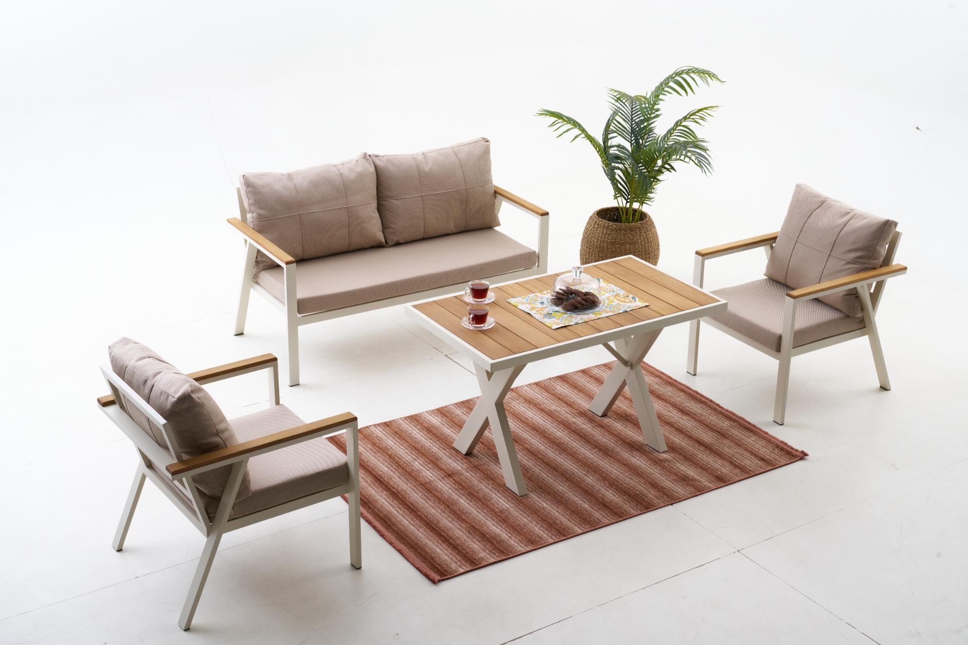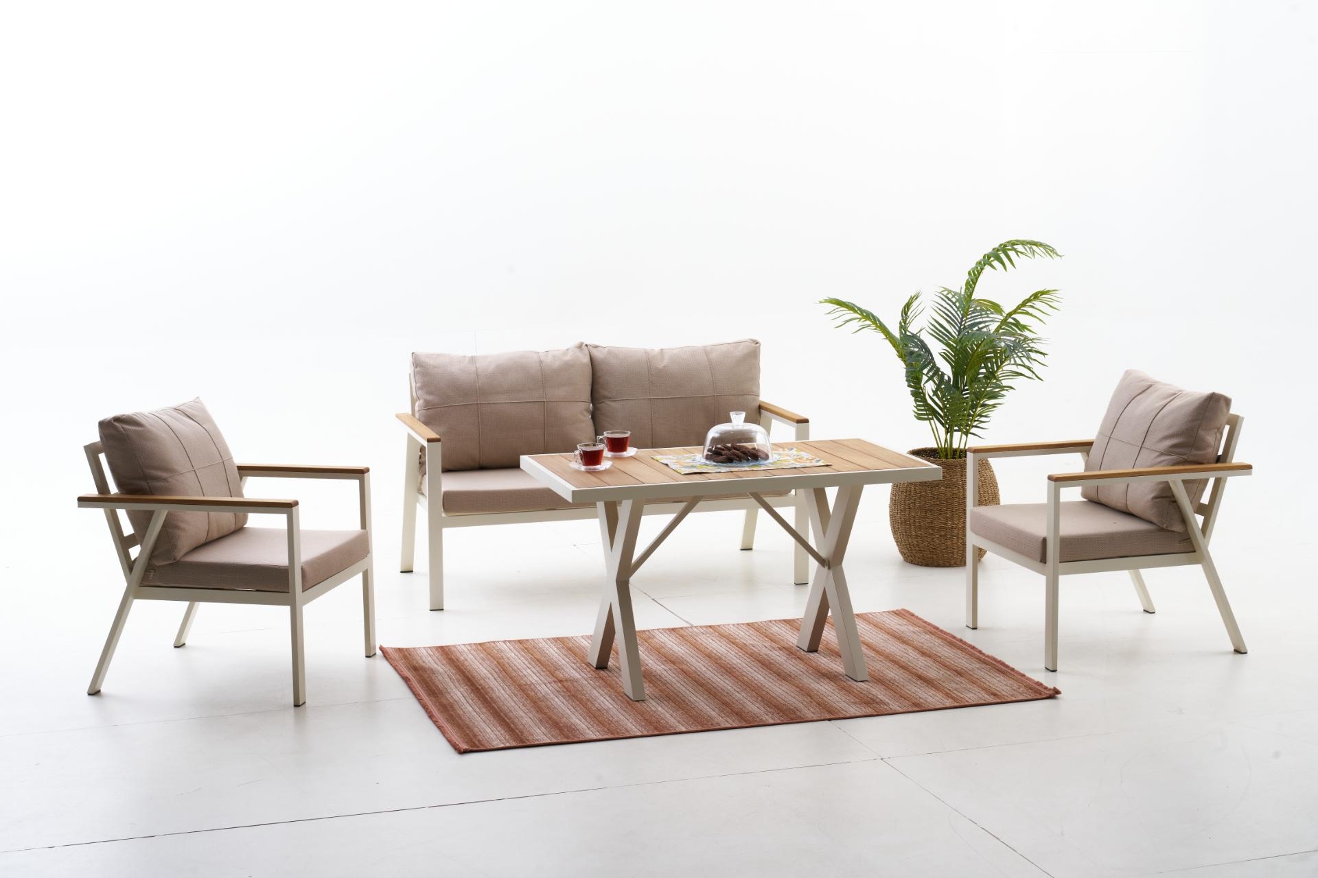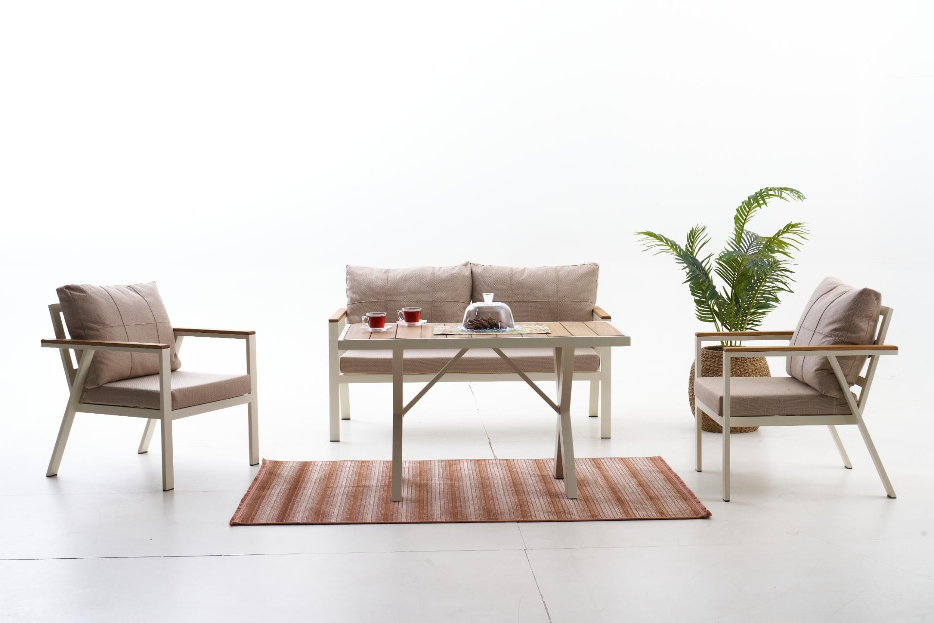 Ek BilgilerNeva Alüminyum Bahçe Oturma Grubu (2+1+1+S) Modern çizgilerle tasarlanan Neva Alüminyum Bahçe Oturma Grubu, dayanıklılığı ve konforu bir araya getirerek açık alan keyfini üst seviyeye taşıyor. Geniş oturum alanı, şık detayları ve kullanışlı yapısıyla bahçenize ya da terasınıza zarif bir dokunuş katıyor. Ürün Özellikleri Dayanıklı İskelet Yapısı: Paslanmaz alüminyumdan üretilmiş iskeleti, dış mekân koşullarına uygun elektrostatik boya ile kaplanmıştır. Uzun ömürlü ve hava koşullarına karşı dirençlidir. Konforlu Sünger Desteği:Oturum minderlerinde kullanılan 30 DNS Soft sünger, formunu uzun süre koruyarak rahat bir oturma deneyimi sunar. Kaliteli Kumaş Detayları:UV katkılı,ışığa karşı dayanıklıvesu itici özellikteki kumaşlar sayesinde güneş ve yağmur altında güvenle kullanılabilir. Leke tutmayan yüzeyi kolay silinebilir yapıdadır. Pratik Kullanım:Fermuarlı minder kılıfları çıkarılıp yıkanabilir; sırt minderleri tamamenelyaf dolgulu olup yumuşak bir destek sağlar. Zarif ve İşlevsel Tasarım: Modern çizgileriyle her ortama uyum sağlar; hem estetik hem ergonomik bir kullanım sunar.