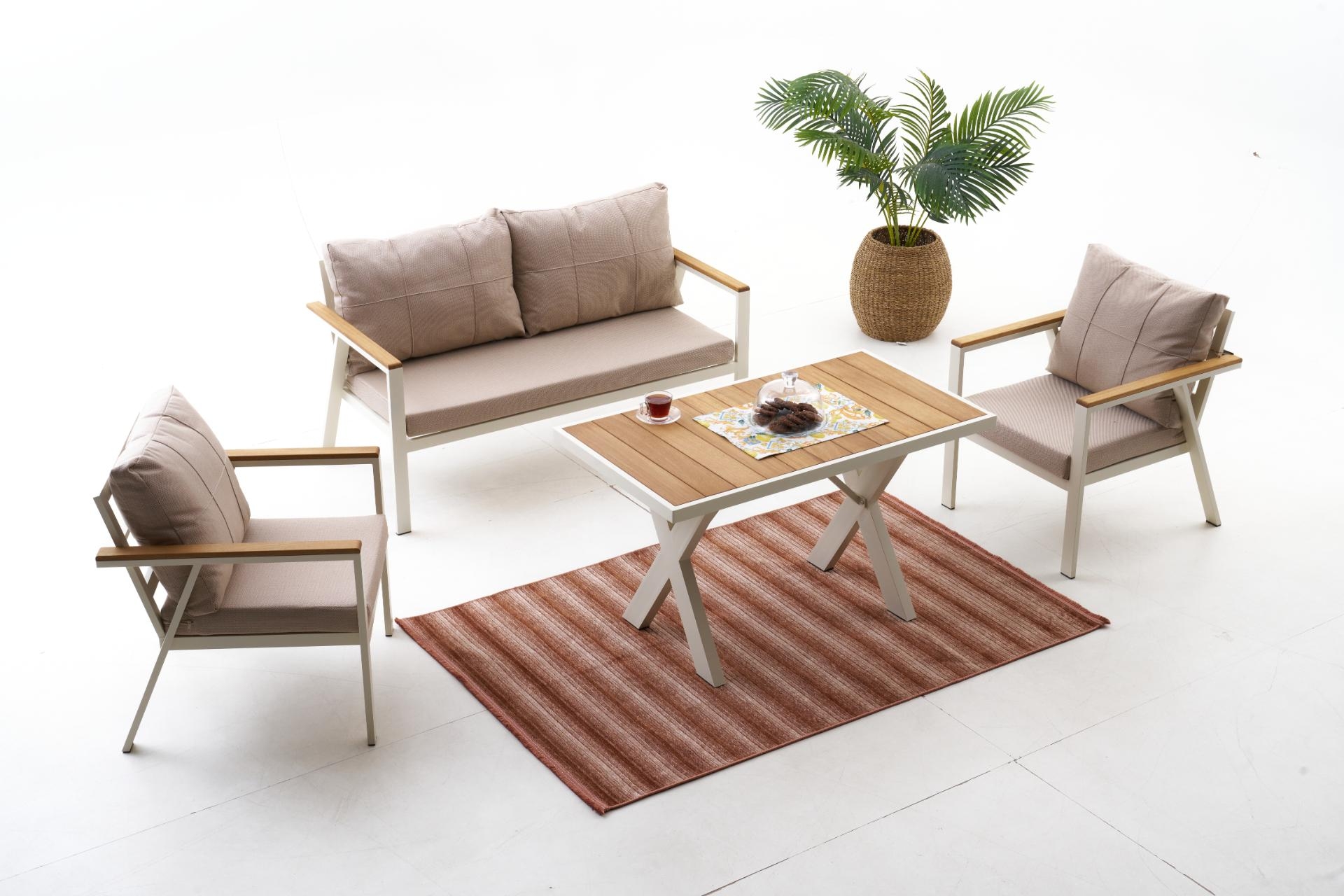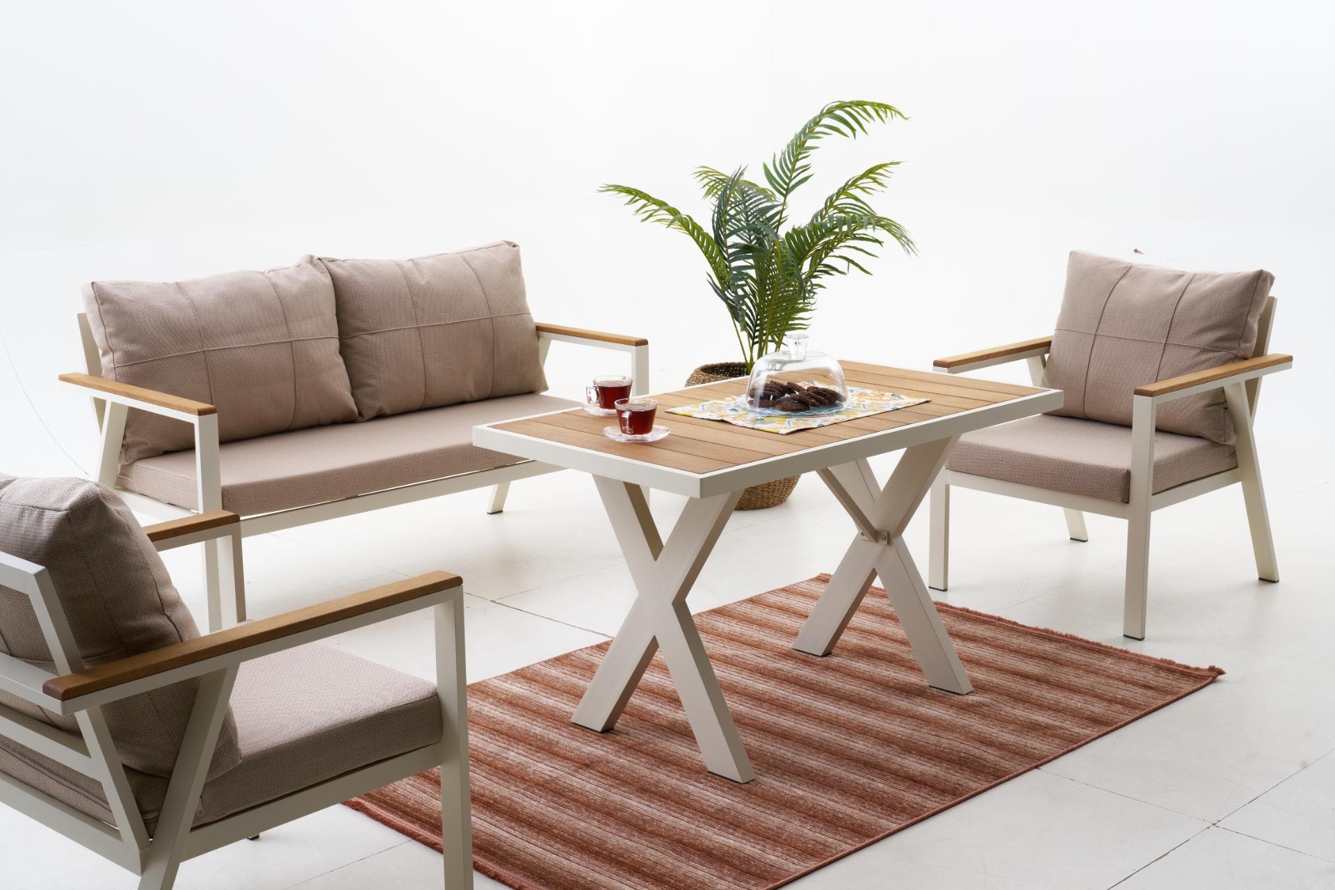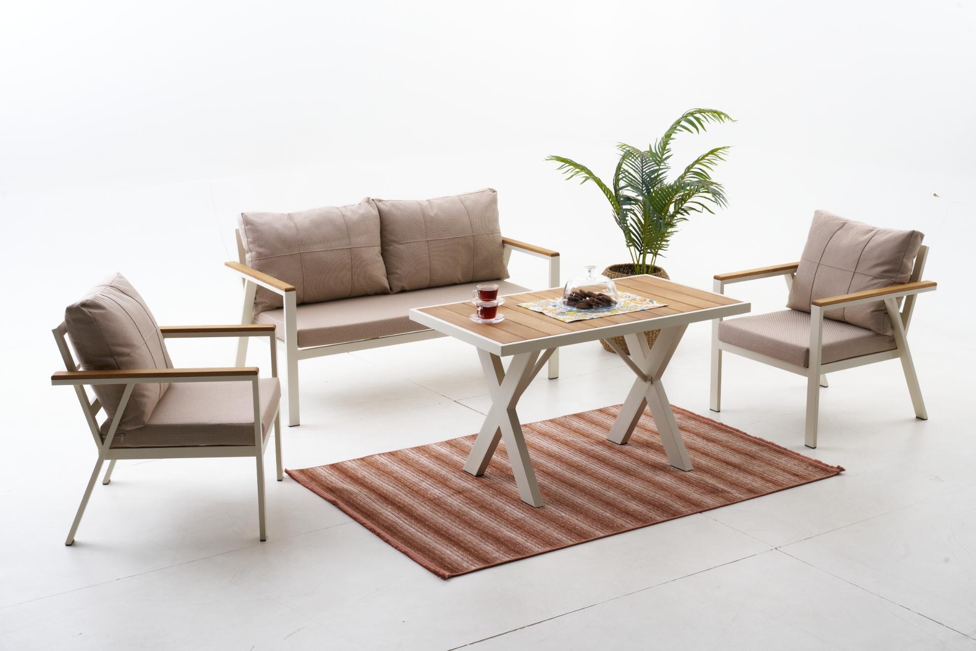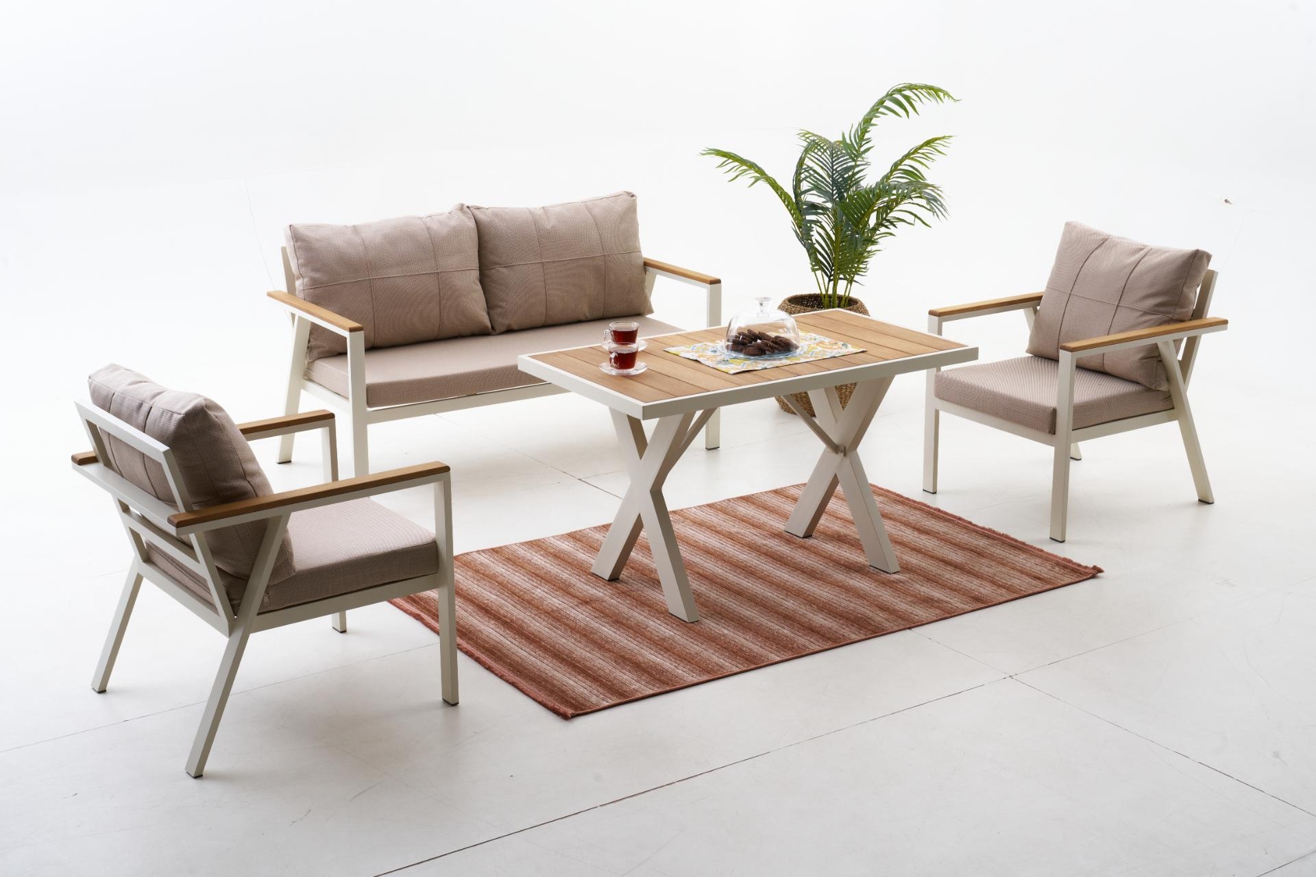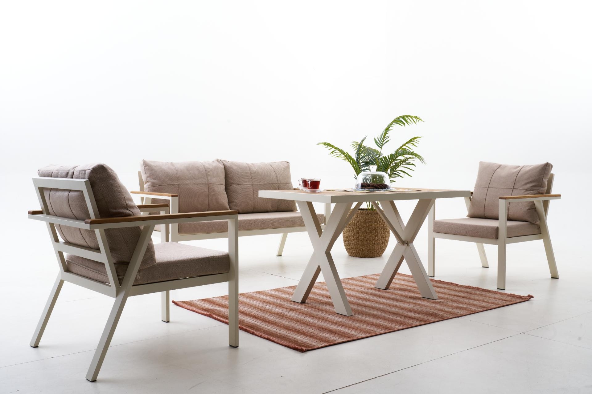 Ek BilgilerNeva Alüminyum Bahçe Oturma Grubu (2+1+1+S) Modern çizgilerle tasarlanan Neva Alüminyum Bahçe Oturma Grubu, dayanıklılığı ve konforu bir araya getirerek açık alan keyfini üst seviyeye taşıyor. Geniş oturum alanı, şık detayları ve kullanışlı yapısıyla bahçenize ya da terasınıza zarif bir dokunuş katıyor. Ürün Özellikleri Dayanıklı İskelet Yapısı: Paslanmaz alüminyumdan üretilmiş iskeleti, dış mekân koşullarına uygun elektrostatik boya ile kaplanmıştır. Uzun ömürlü ve hava koşullarına karşı dirençlidir. Konforlu Sünger Desteği:Oturum minderlerinde kullanılan 30 DNS Soft sünger, formunu uzun süre koruyarak rahat bir oturma deneyimi sunar. Kaliteli Kumaş Detayları:UV katkılı,ışığa karşı dayanıklıvesu itici özellikteki kumaşlar sayesinde güneş ve yağmur altında güvenle kullanılabilir. Leke tutmayan yüzeyi kolay silinebilir yapıdadır. Pratik Kullanım:Fermuarlı minder kılıfları çıkarılıp yıkanabilir; sırt minderleri tamamenelyaf dolgulu olup yumuşak bir destek sağlar. Zarif ve İşlevsel Tasarım: Modern çizgileriyle her ortama uyum sağlar; hem estetik hem ergonomik bir kullanım sunar.