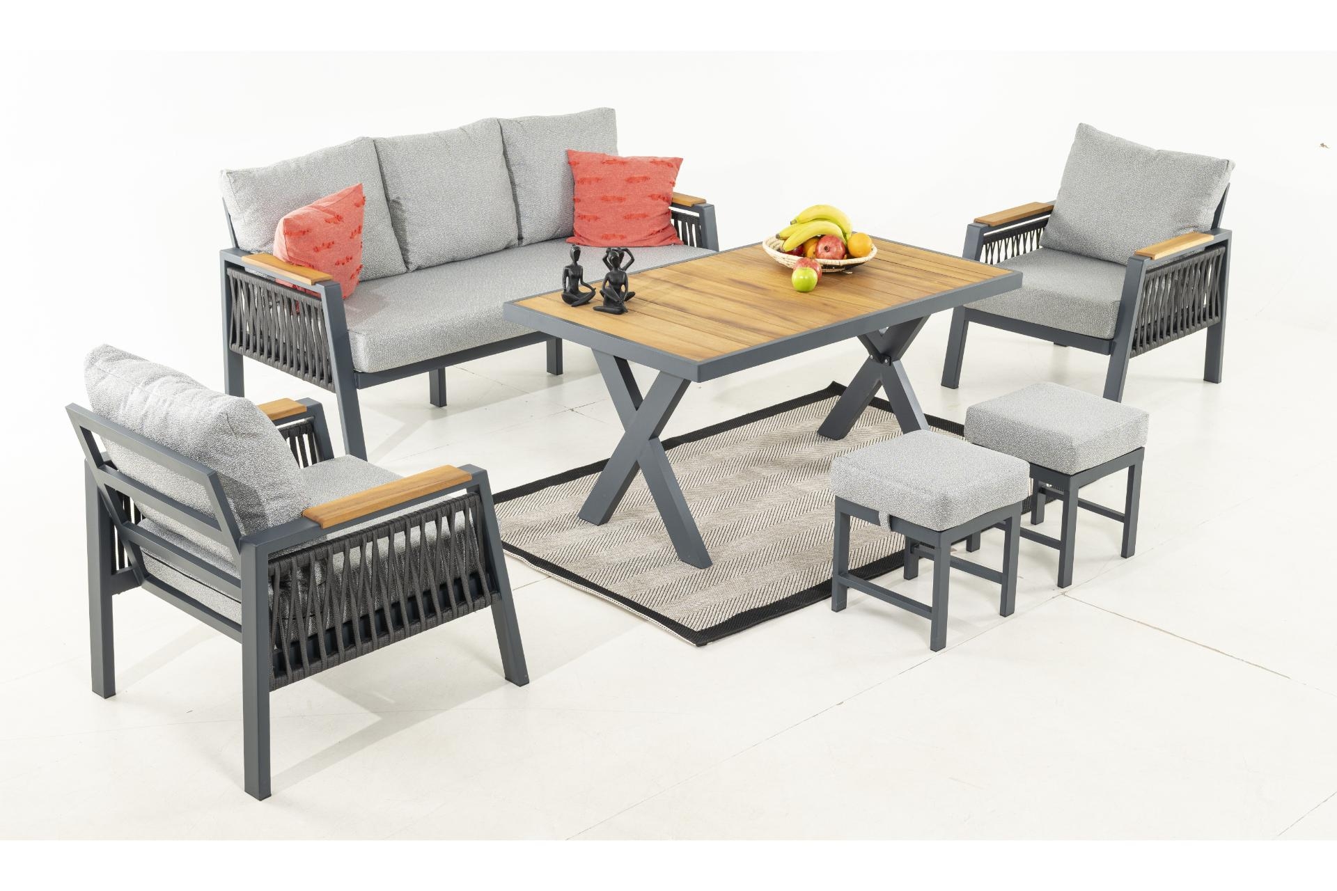 Ek BilgilerÖne Çıkan Teknik Detaylar Paslanmaz Alüminyum İskelet: İskelet yapısında kullanılan yüksek kaliteli alüminyum, elektrostatik toz boya ile kaplanmıştır. Bu sayede her türlü hava koşuluna karşı dirençli, paslanmaz ve uzun ömürlü bir kullanım sağlar. Doğal İroko Ahşap Detaylar: Masanın üst tablasında ve kolçaklarda kullanılan birinci sınıf İroko ahşabı, dış mekâna uygunluğu ve şıklığıyla bilinir. Doğanın sıcaklığını modern tasarım ile buluşturur. Üstün Oturum Konforu: Koltuklarda kullanılan32 DNS sünger, vücudunuzu destekleyerek uzun süreli oturumlarda bile maksimum konfor sunar. Sırt minderleri ise tamamen elyaf dolgusuyla yumuşak bir yaslanma deneyimi sağlar. Leke Tutmayan, Su İtici Kumaş: Minder kılıfları UV katkılı kumaştan üretilmiştir; güneş ışınlarına karşı solma yapmaz. Su itici özelliği sayesinde dış mekânda güvenle kullanılır. Ayrıca fermuarlı yapısı sayesinde kılıfları kolayca çıkarıp yıkayabilirsiniz.