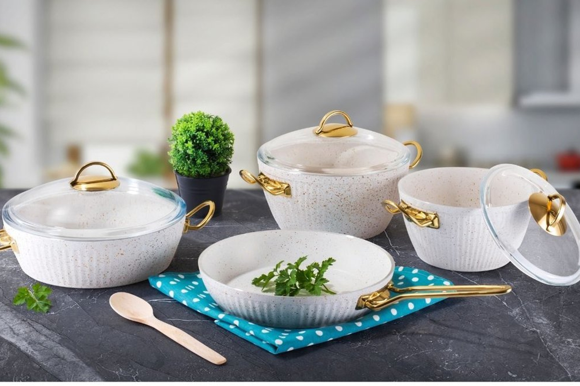OSCAR 7 PARÇA ALTIN METAL KULPLU BEYAZ GRANİT TENCERE SETİ 35 cm 53 cm 28 cm