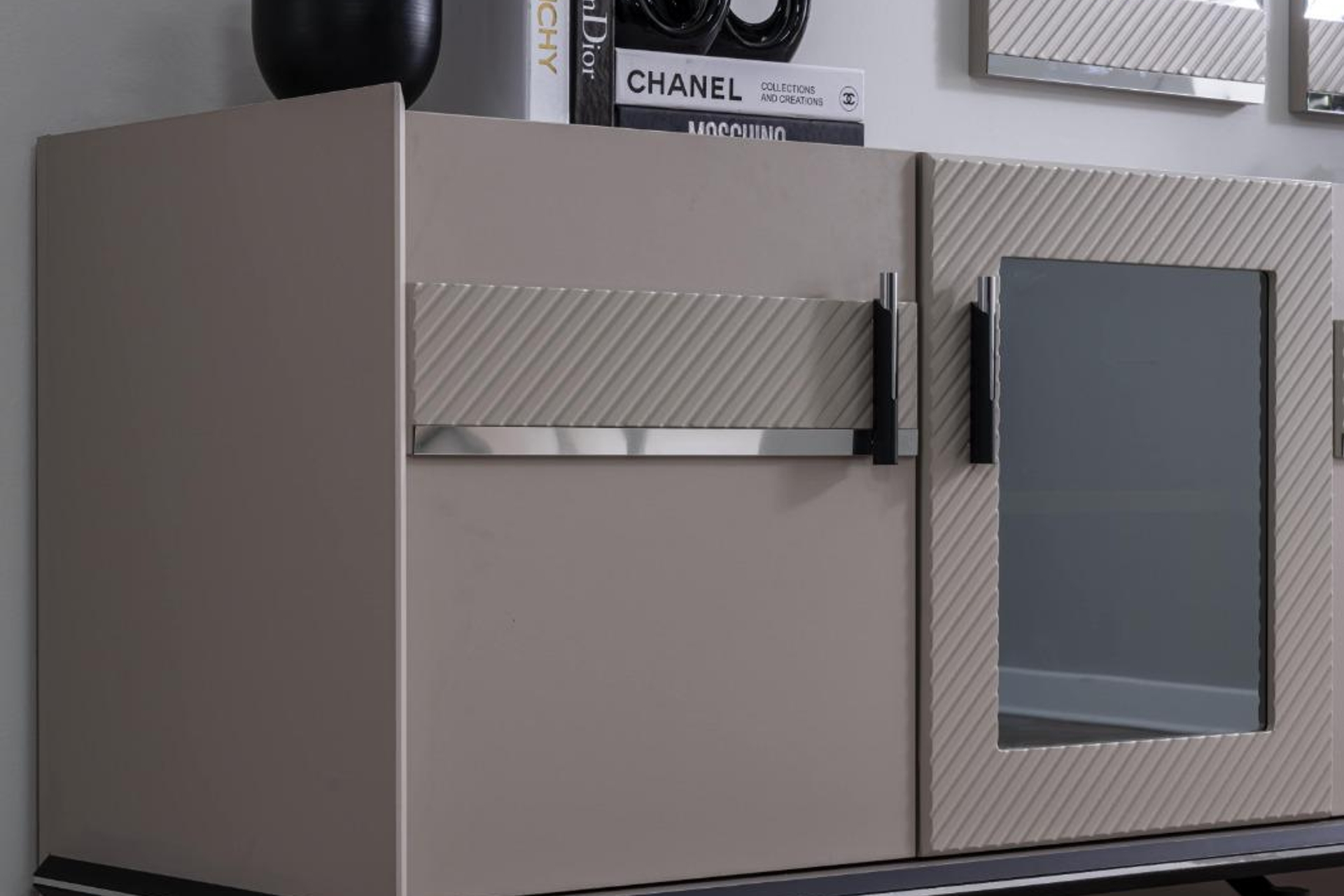 TasarımÜrün Özellikleri: Gövde Yapısı: Dayanıklı ve uzun ömürlü malzeme kullanımı, pürüzsüz vizon yüzey bitişi. Tasarım Detayları: Kapak yüzeylerinde kullanılan diyagonal kabartma doku, hareketli bir görsel sunarken ortadaki ayna panel tasarımı modern bir kontrast yaratır. Ayak ve Kulp Grubu: Endüstriyel şıklığı temsil eden ince siyah metal ayaklar, zeminden yüksek yapısı sayesinde temizlik kolaylığı ve ferah bir görünüm sağlar. Ayna Seti: Konsolun tasarım dilini tamamlayan, üzerindeki geometrik çizgilerle derinlik algısını güçlendiren ikili dikey ayna tasarımı. Bu parça, sadece bir mobilya değil; yaşam alanınızın odak noktası olacak bir dekorasyon öğesidir.