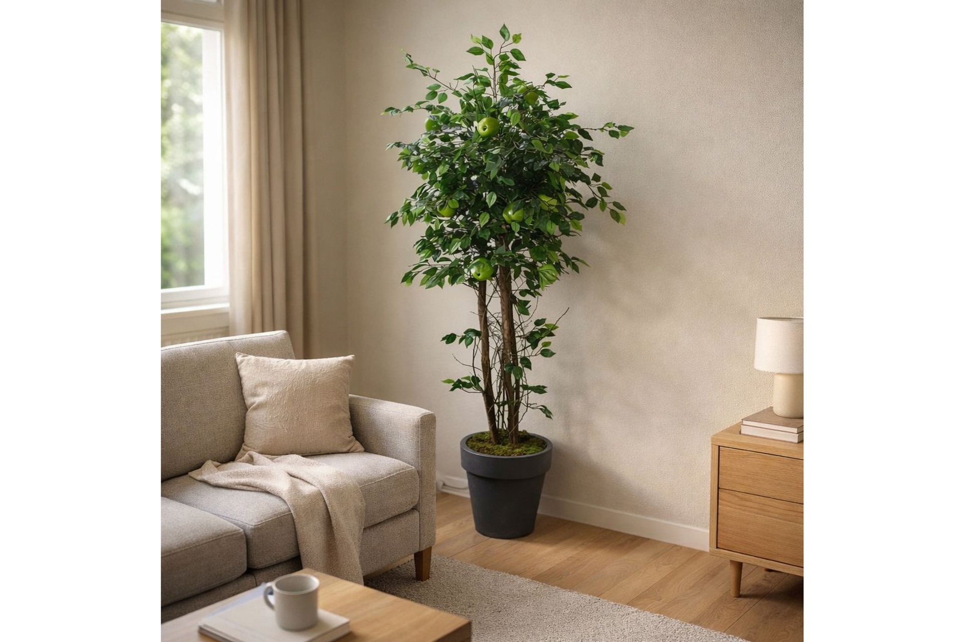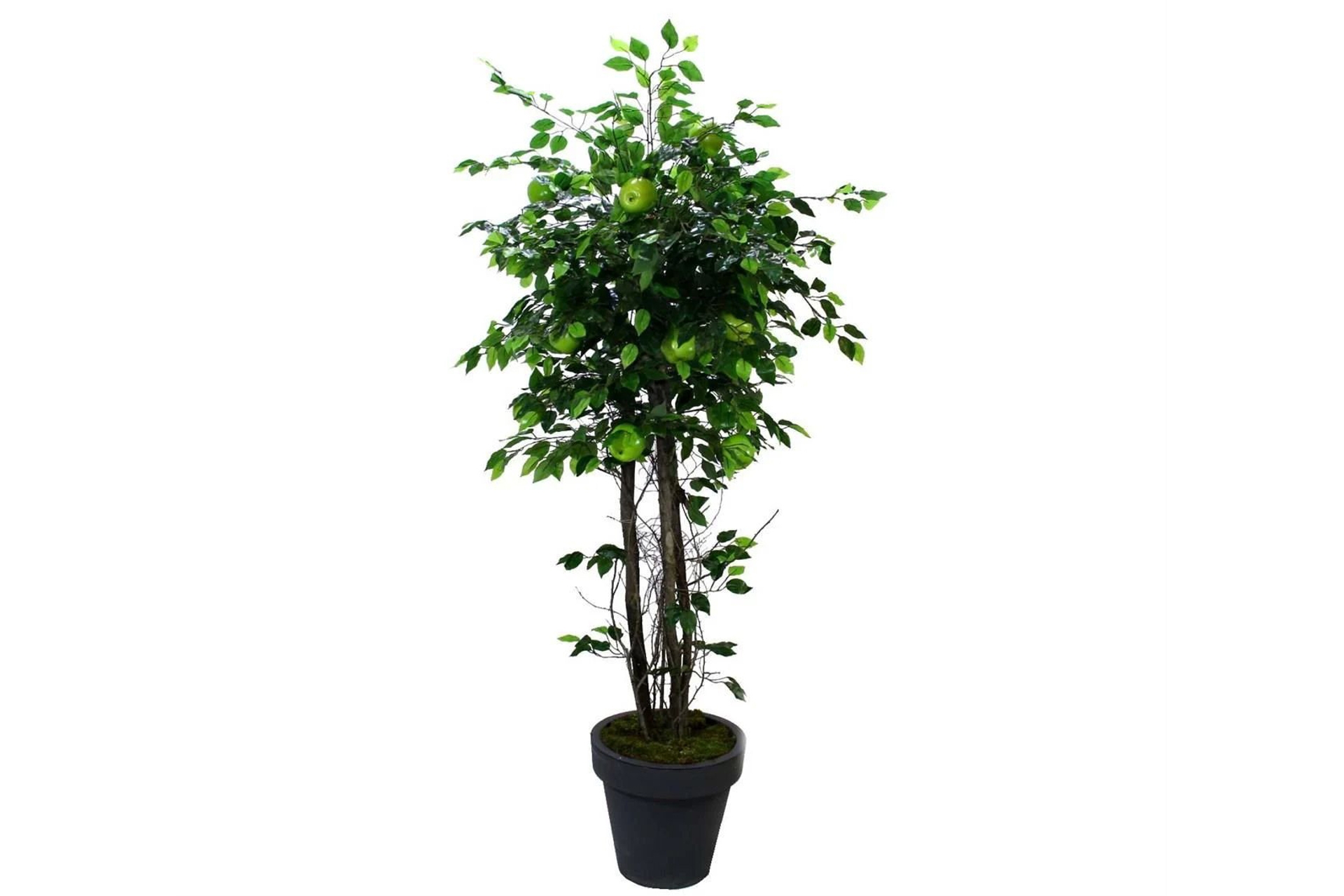 Ek BilgilerGerçekçi yaprak dokusu ve yeşil elma detaylarıyla evinize/ofisinize doğal bir görünüm kazandırır. Bakım gerektirmez; sulama veya budama istemeden her mevsim canlı görünümünü korur. Şık saksısı sayesinde salon, balkon, ofis ve ticari alanlarda dekoratif kullanım için idealdir. Not: Saksı rengi stok durumuna göre değişiklik gösterebilir. Ürün Özellikleri Boy: 175 cm Malzeme: Plastik Renk: Yeşil Kullanım: İç & dış mekan Detay: 15 yeşil elma, 36 dal
