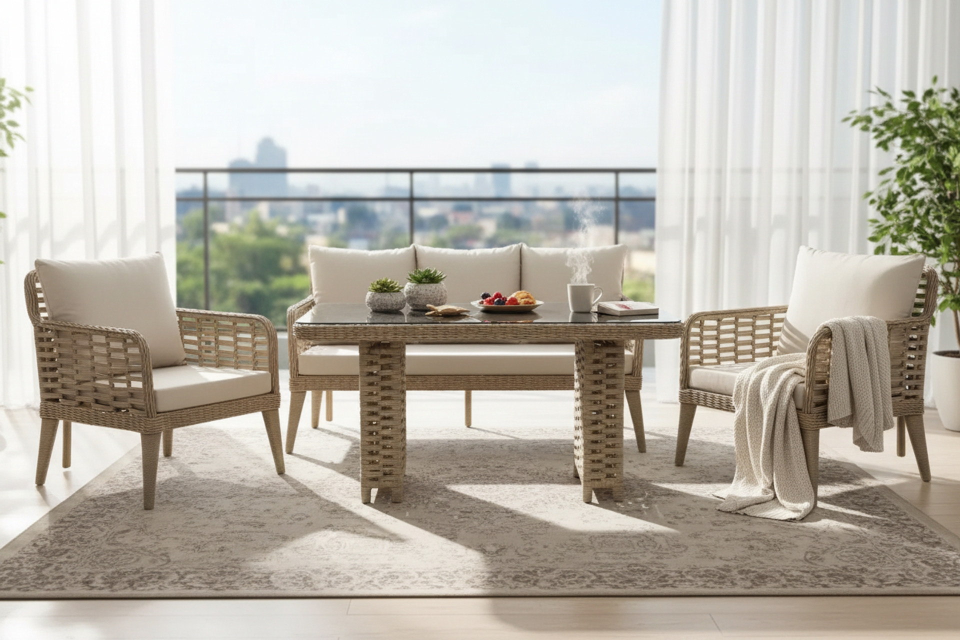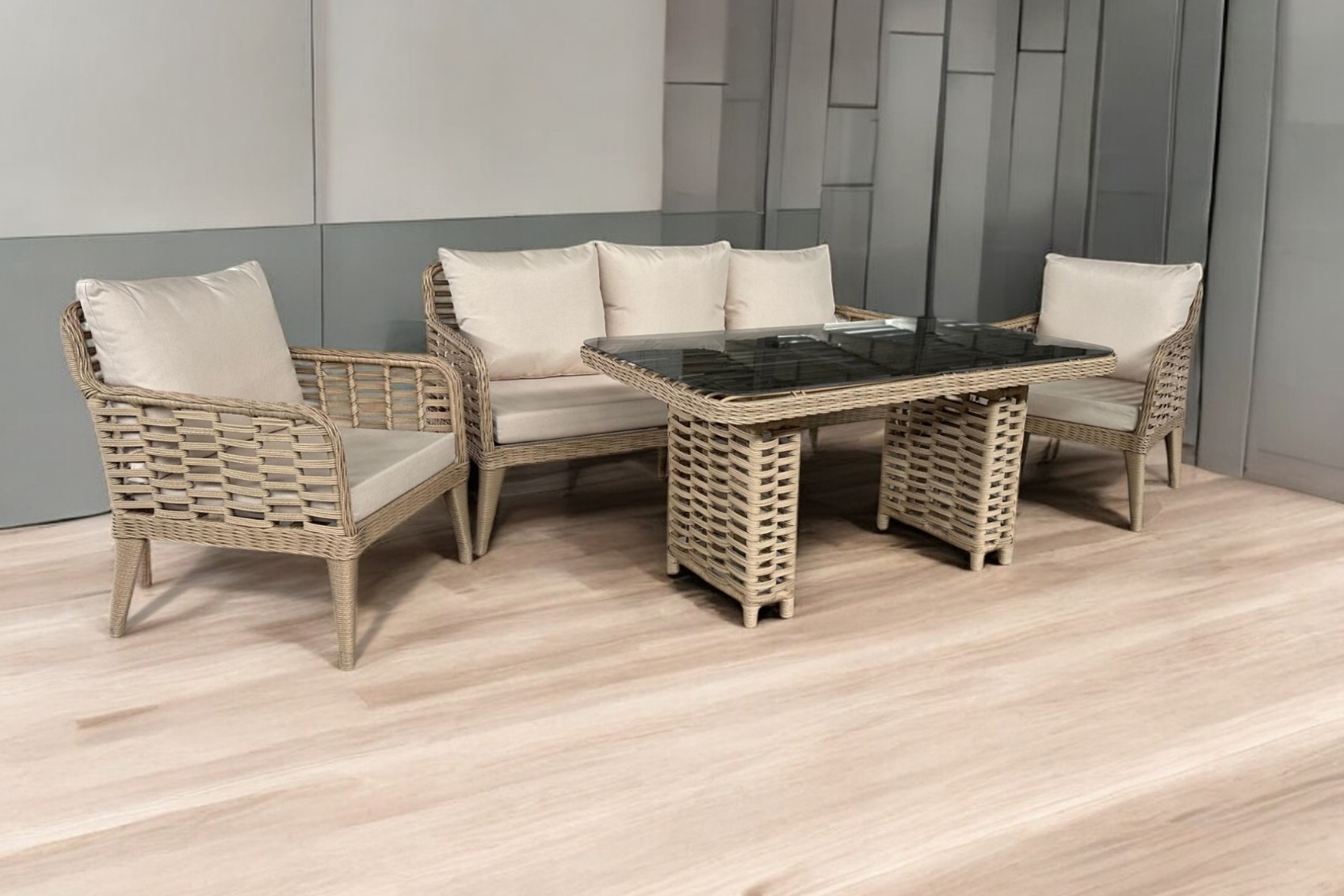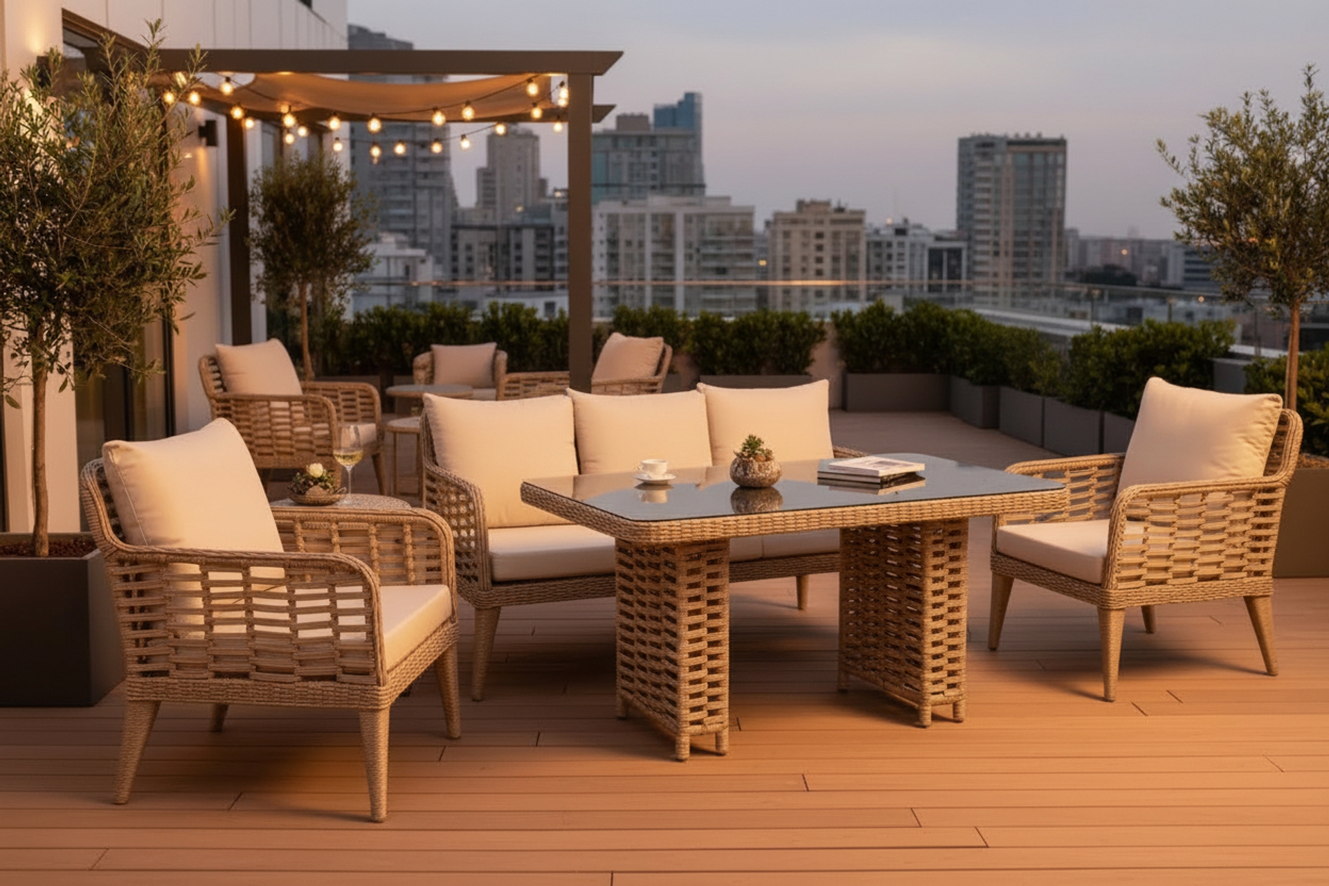Takım İçeriğiBahçe için en dayanıklı seçenek sentetik PE rattan olmalı — UV dayanıklı, suya ve güneşe karşı dirençli, uzun ömürlü.
