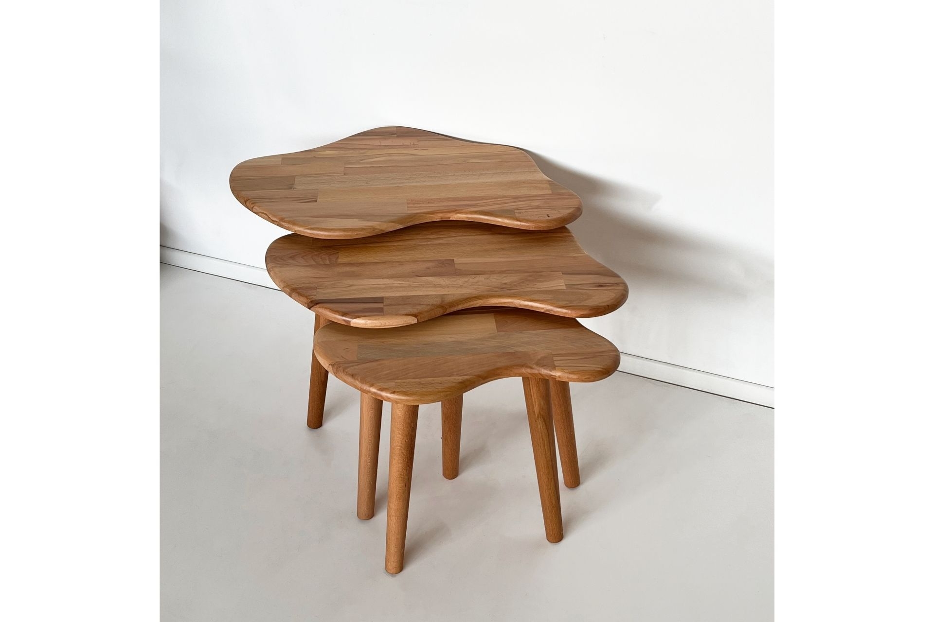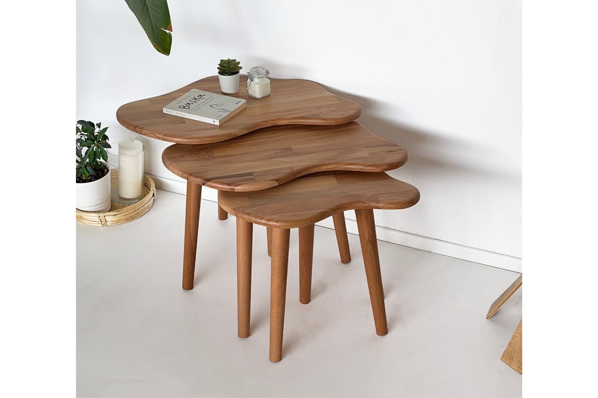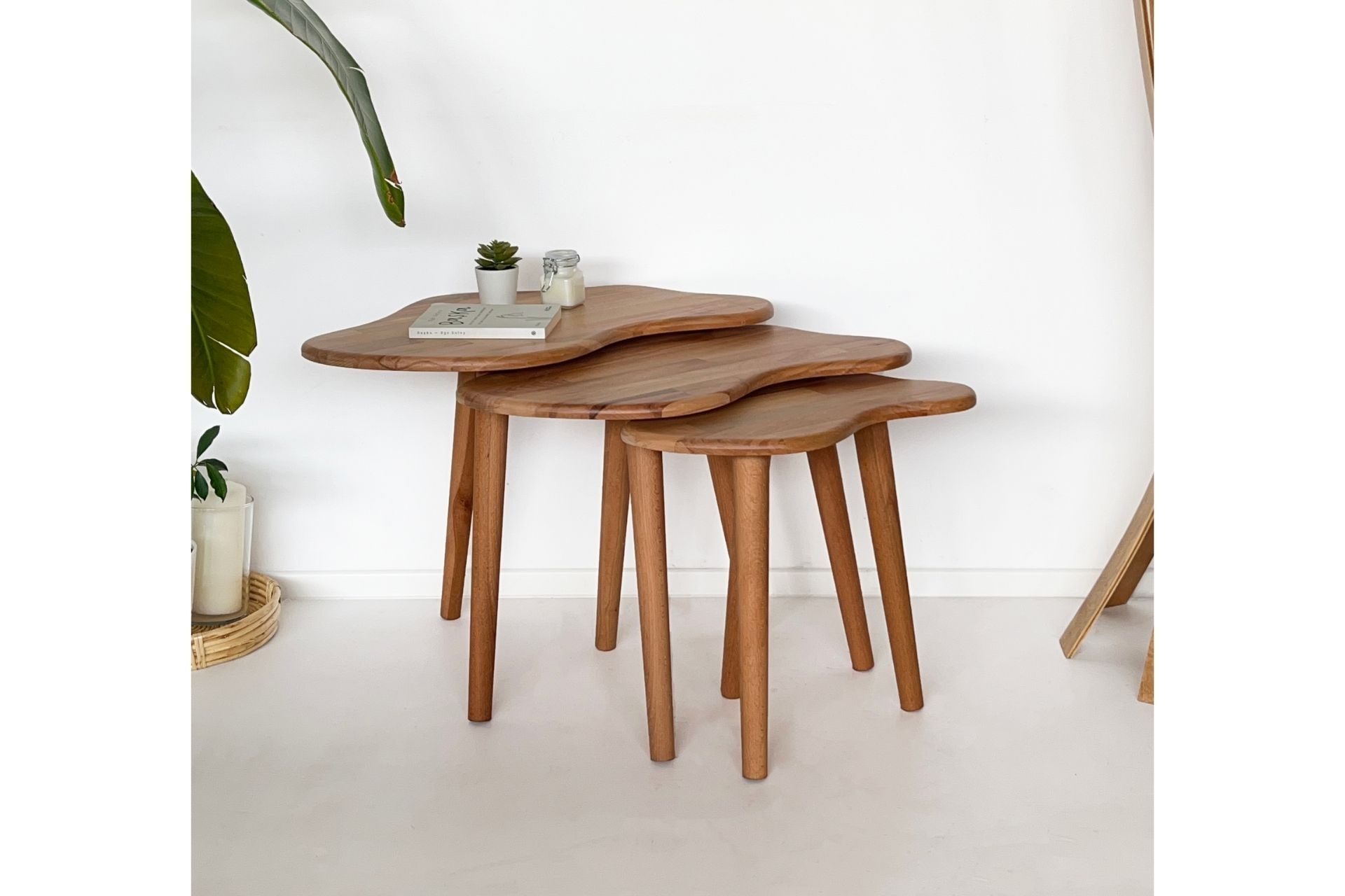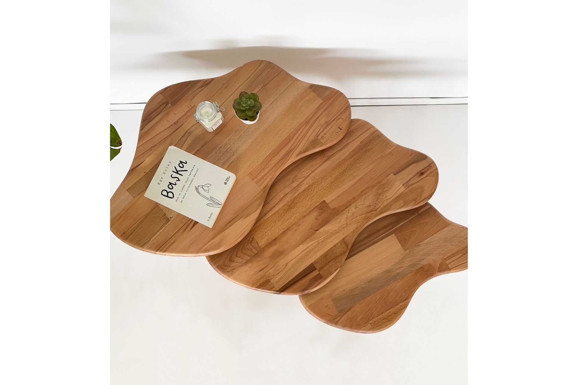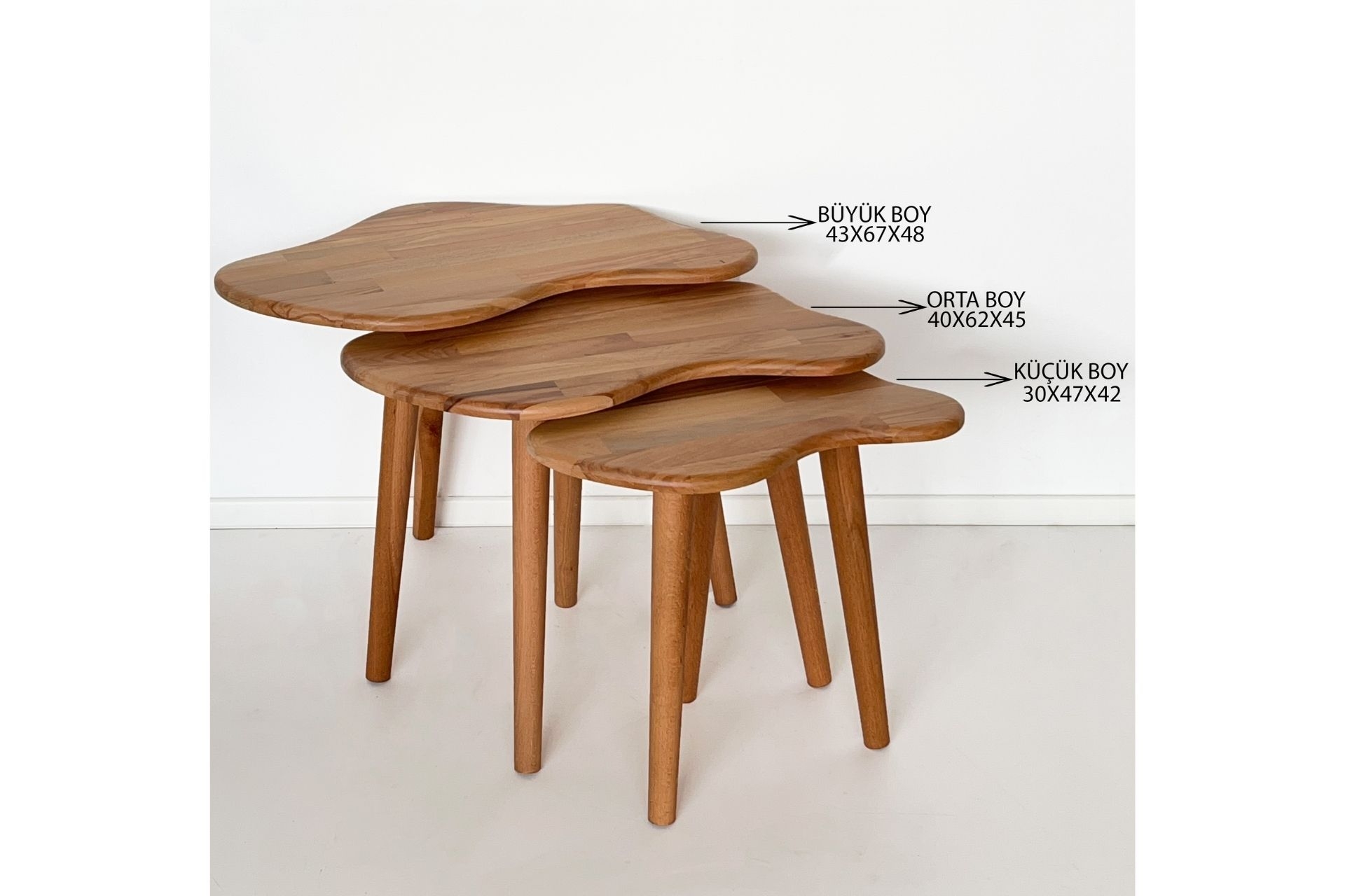 Ek BilgilerSehpa takımı tamamen masif ahşaptan üretilmiştir. Doğal dokusu, ahşabın sıcak ve zarif görünümünü yansıtır. Modern ve minimal çizgilerle tasarlanmıştır. Farklı boyutlardaki üç sehpa birbiriyle uyumlu şekilde kullanılabilir. Üstüne dekoratif objeler, kitaplar veya bitkiler yerleştirmek için idealdir. Kaliteli ahşap ve güçlü bağlantı noktaları sayesinde uzun ömürlüdür. Dengeli yapısıyla güvenli bir kullanım sunar. Ahşap yüzey nemli bir bezle kolayca temizlenebilir. Her parça özenle işlenmiş, kusursuz bir görünüm sunar. Tamamen doğal ağaçtan üretildiği için her ürün, ağacın kendine özgü dokusu ve renk tonlarıyla doğal ve benzersiz desen farklılıklarına sahip olabilir. Ürün Ölçüleri : Büyük Boy Sehpa : Yükseklik = 48 cm Genişlik X Derinlik = 67 X 43 cm Orta Boy Sehpa : Yükseklik = 45 cm Genişlik X Derinlik = 62 X 40 cm Küçük Boy Sehpa : Yükseklik = 42 cm Genişlik X Derinlik = 47 X 30 cm