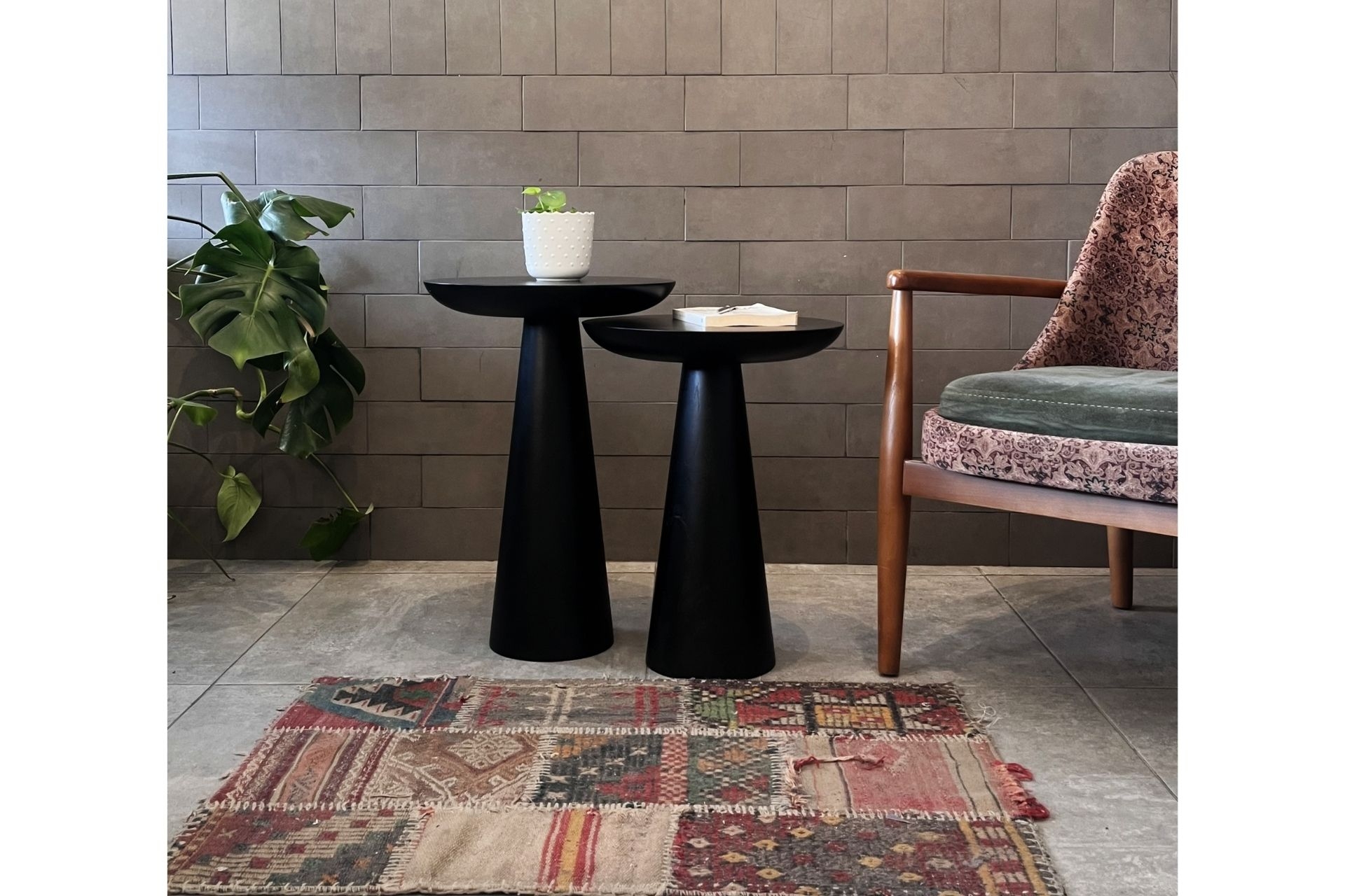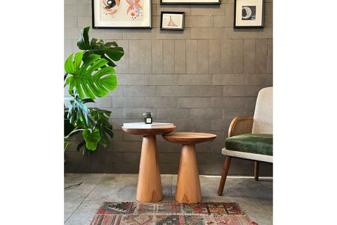 Ek BilgilerDoğadan ilham alan mantar formu ile tasarlanan 2'li zigon mantar sehpa, masif ahşabın sıcak dokusunu modern ve minimal çizgilerle bir araya getirir. Farklı yüksekliklere sahip iki sehpa, birlikte ya da ayrı ayrı kullanılarak yaşam alanlarında fonksiyonel ve estetik bir çözüm sunar. Tamamı masif ahşaptan üretilen bu sehpa takımı; salon, oturma odası, yatak odası ve butik mekânlarda yan sehpa veya dekoratif tamamlayıcı olarak rahatlıkla kullanılabilir. Üst yüzeyleri dekoratif objeler, kitaplar, mumlar veya bitkiler için idealdir. El işçiliğiyle özenle üretilen her bir parça, doğal ahşabın kendine özgü damar yapısını taşır. Bu nedenle ürünler arasında renk tonu, doku ve desen farklılıkları görülebilir; bu durum her sehpayı benzersiz kılar. Ürün vernikli ahşap yüzeye sahiptir. Dayanıklı gövdesi, güçlü yapısı ve dengeli tabanı sayesinde uzun ömürlü ve güvenli bir kullanım sunar. Vernikli yüzey, ahşabın doğal görünümünü korurken nemli bir bezle kolayca temizlenmesini sağlar. Ürün Ölçüleri Üst Tabla Çapı: 37 cm Büyük Boy Mantar Sehpa: Yükseklik: 50 cm Orta Boy Mantar Sehpa: Yükseklik: 45 cm